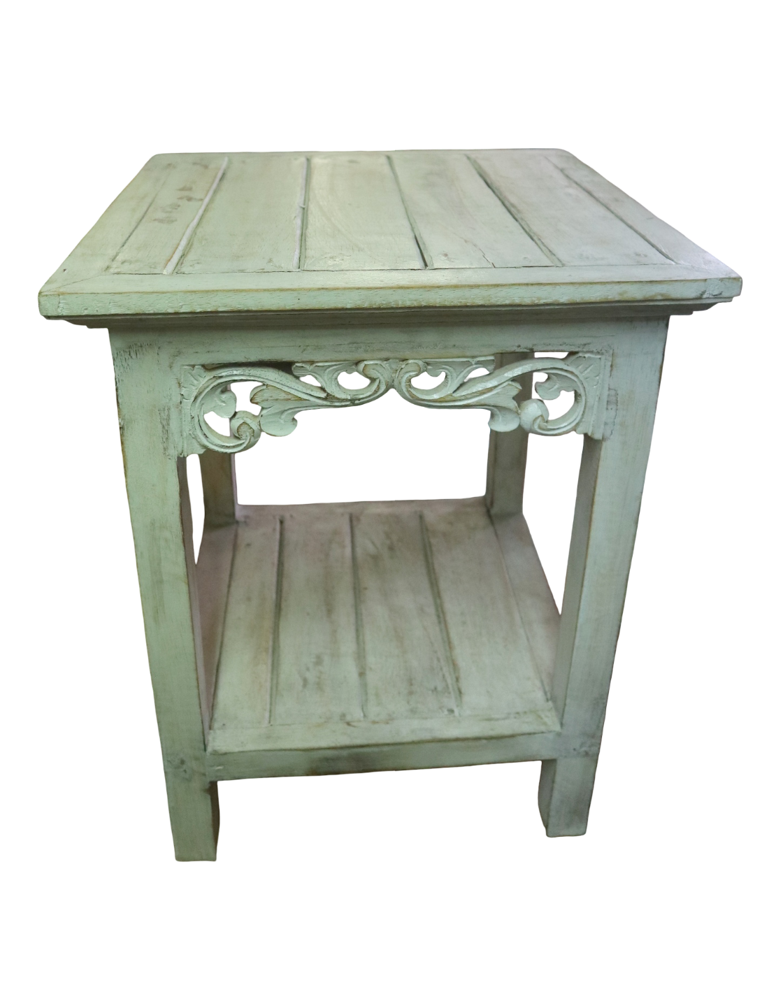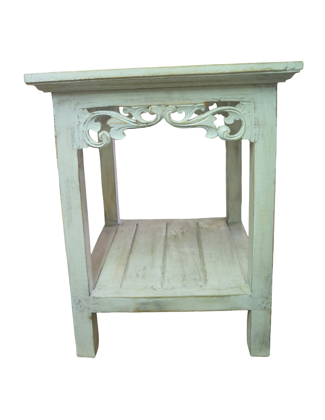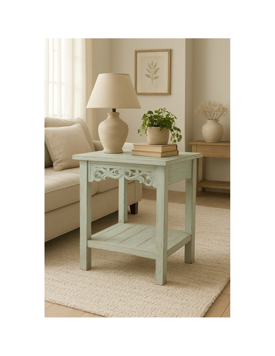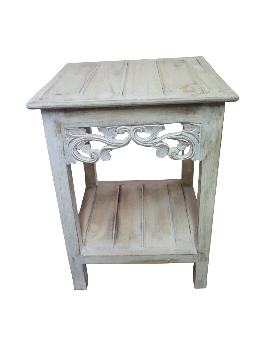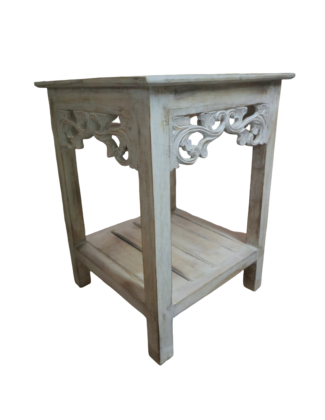Il design unico, con intagli decorativi lavorati a mano, valorizza ogni ambiente: perfetta come tavolino laterale in soggiorno, comodino in camera o base portavaso in veranda.