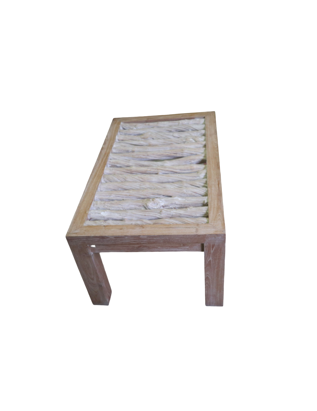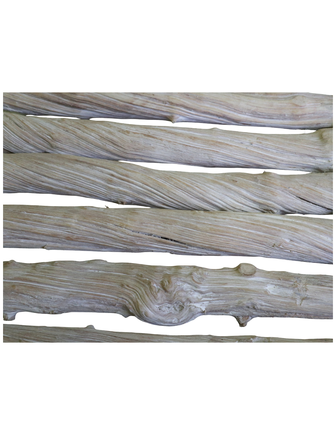 Il piano è composto da vere liane essiccate, inserite in una solida struttura in legno di teak massello con finitura decapata, che ne esalta le venature e le sfumature naturali.