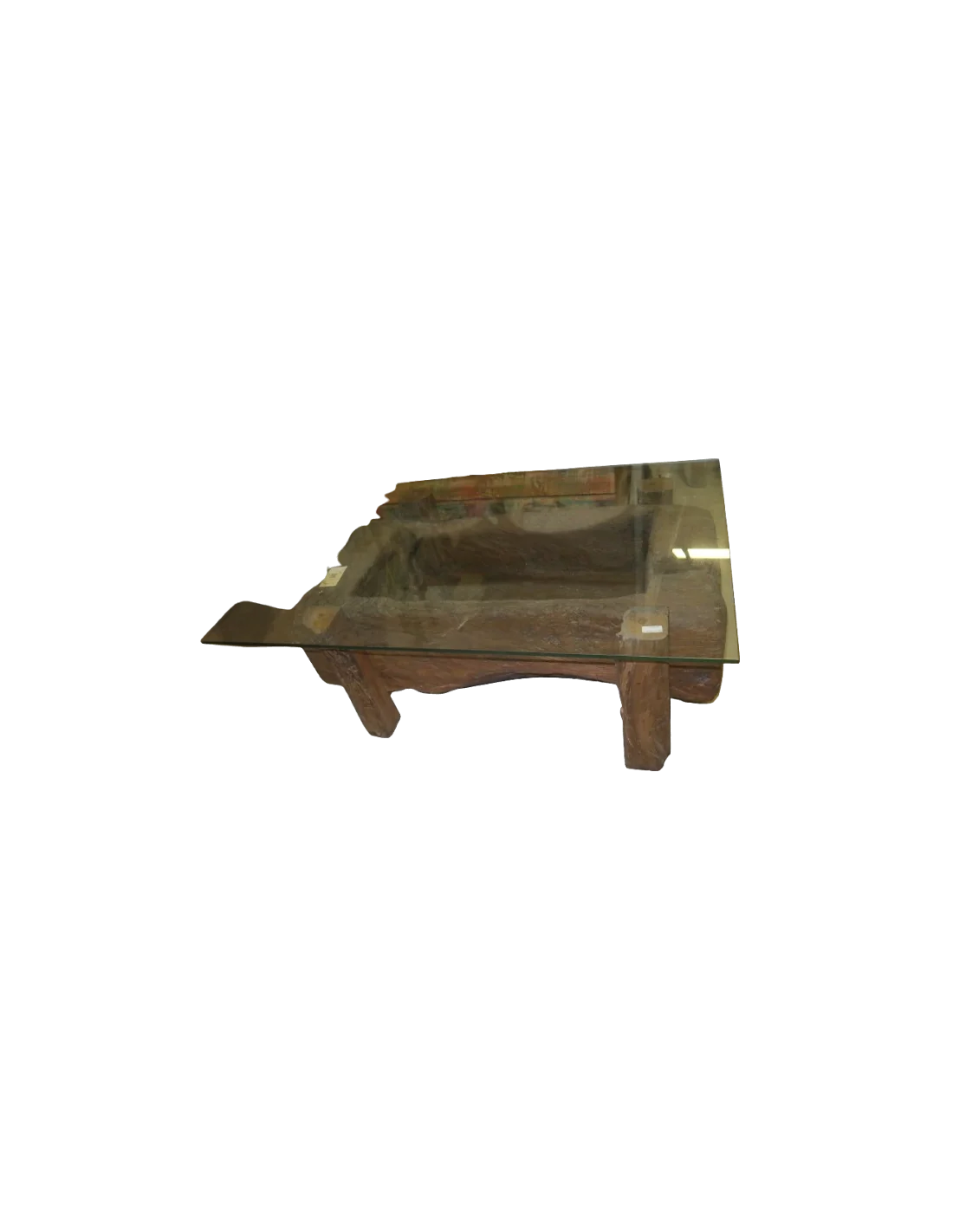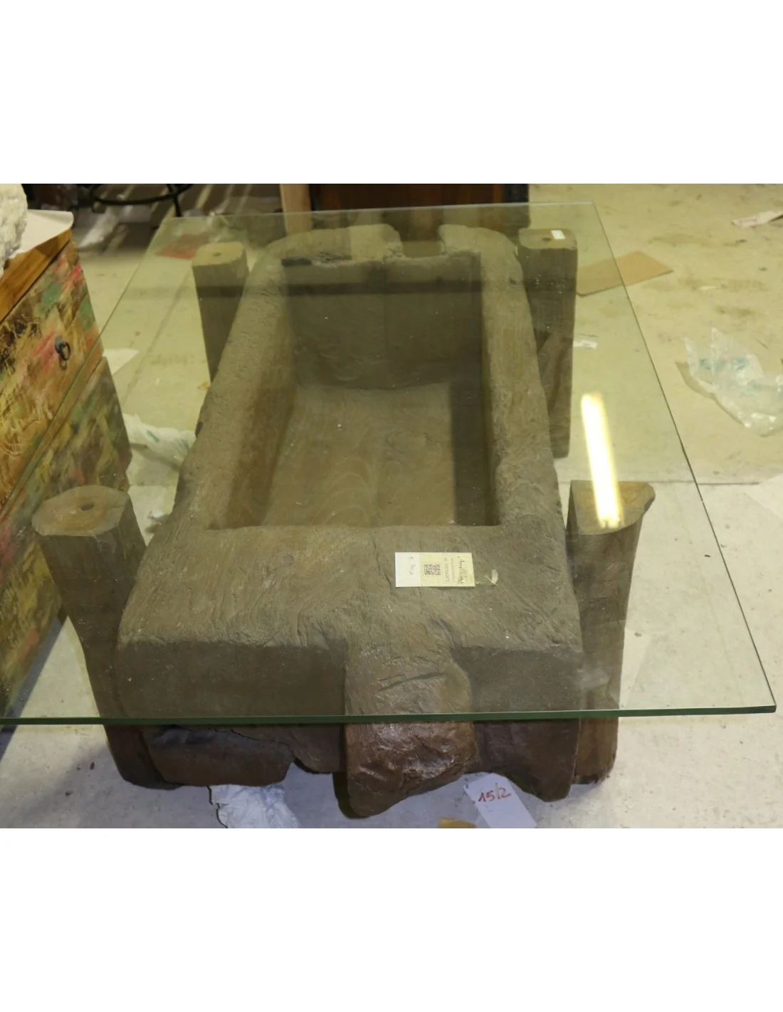 L’oggetto, risalente a circa 200 anni fa, è stato trasformato mantenendo intatta la sua anima originale, valorizzata da un elegante piano in vetro trasparente che permette di ammirare pienamente la forza materica e le forme scolpite dal tempo.