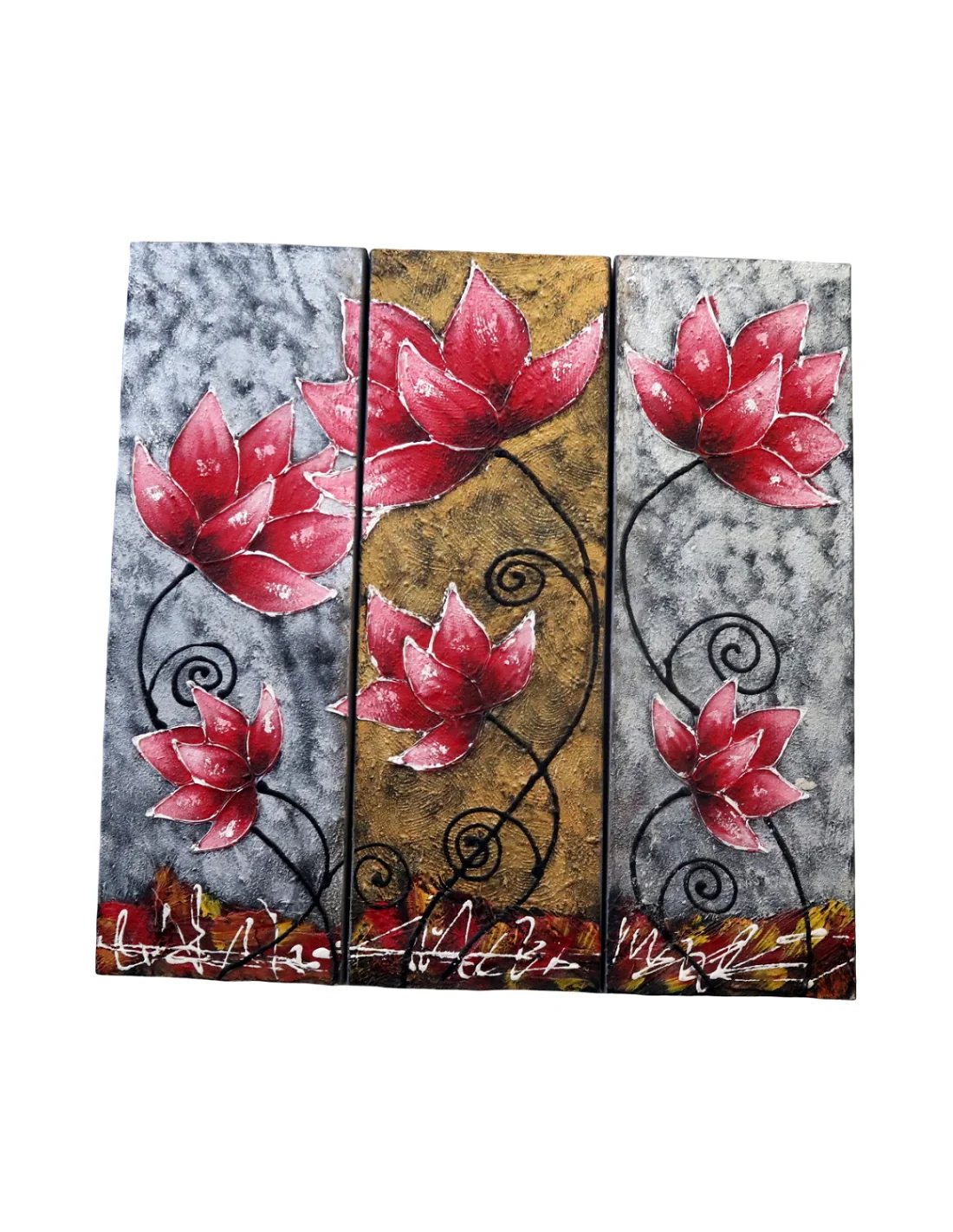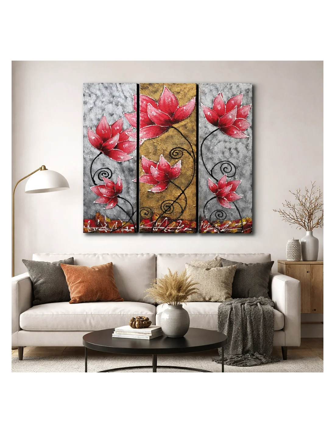 🌺 Quadro Moderno 3 Tele “Red Lotus Harmony” 90x90 cm – Dipinto a Mano in Acrilico Materico su Tela – Arte Indonesiana