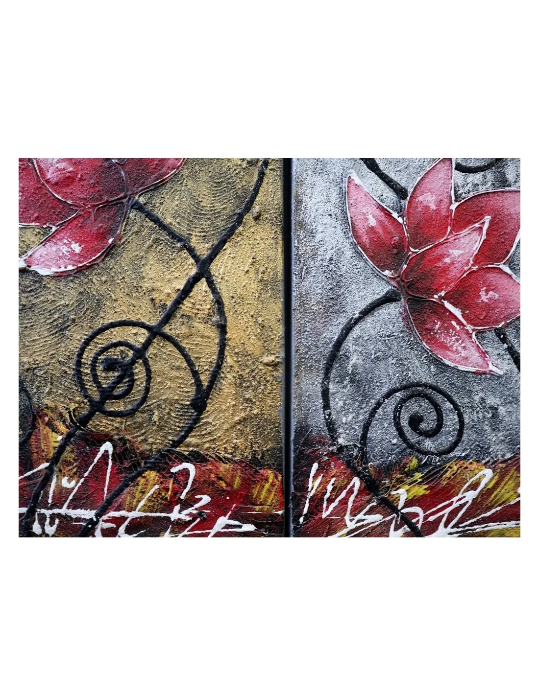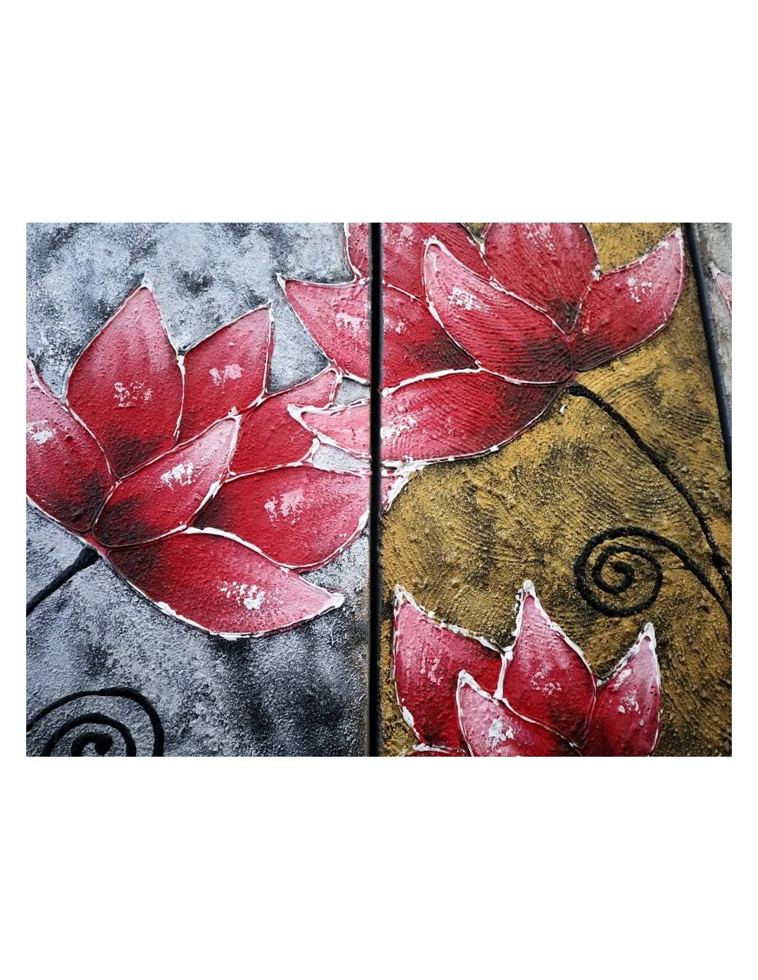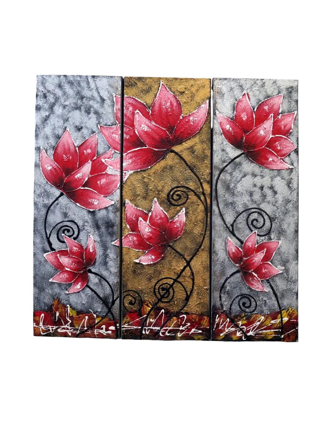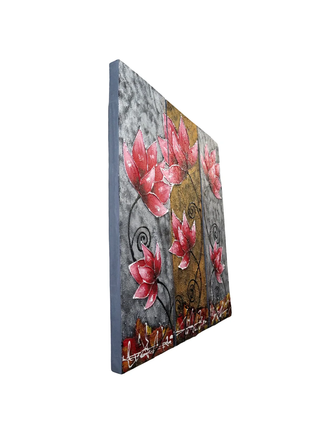 Questo splendido quadro composto da 3 tele unite (misura totale 90x90 cm – spessore 4 cm) rappresenta maestosi fiori di loto rossi, simbolo universale di rinascita, purezza e forza interiore.