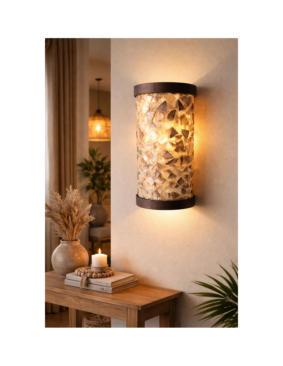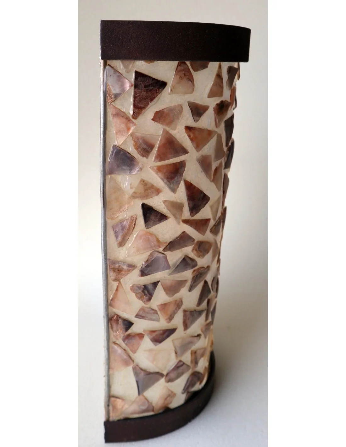 Questa lampada da parete misura 15x10x30 cm ed è composta da una solida struttura in metallo con finitura brunita e da un corpo cilindrico in resina colata artigianalmente, all’interno della quale sono incastonati frammenti triangolari di madreperla naturale.
