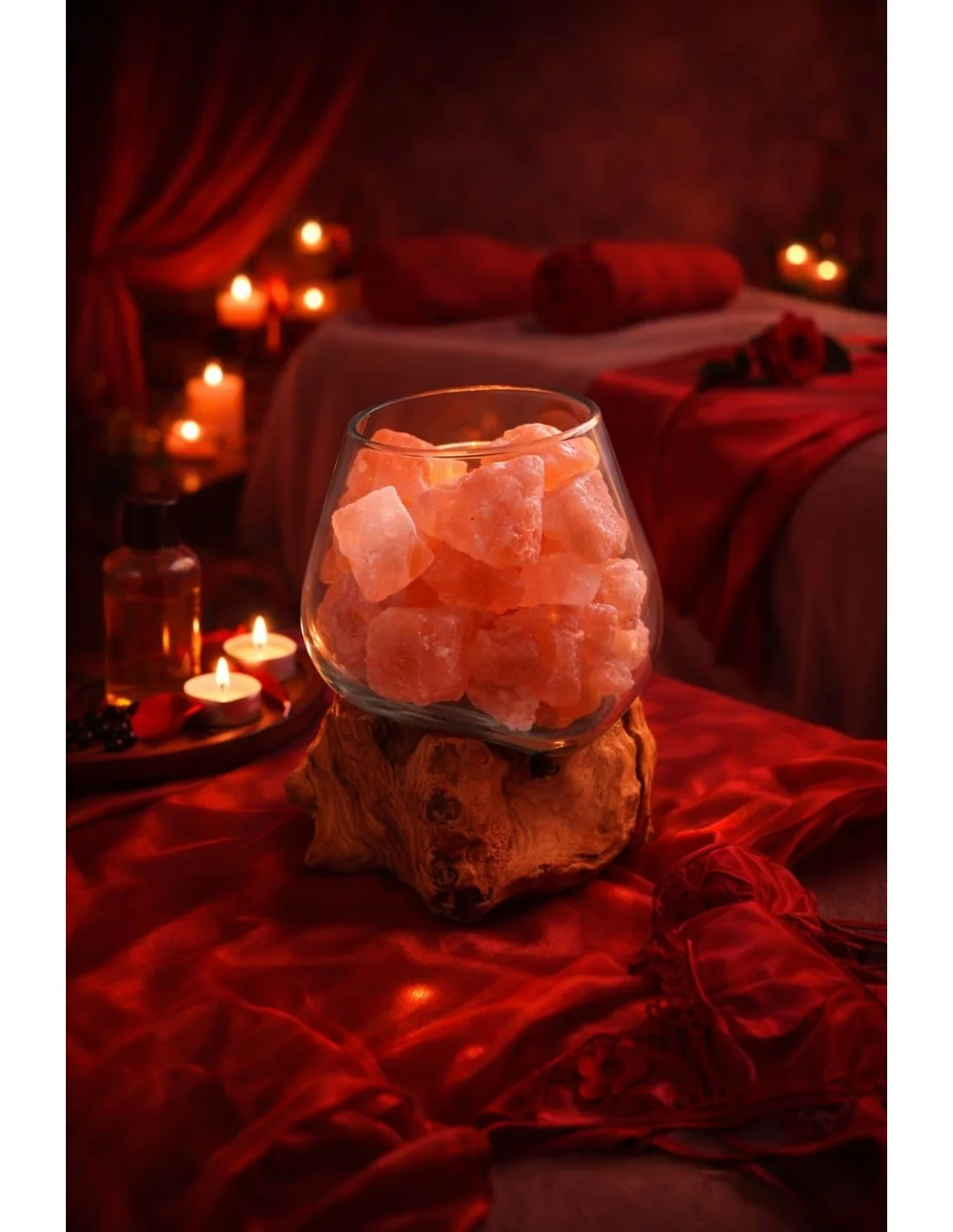 All’interno dell’ampolla, pezzi irregolari di sale rosa dell’Himalaya diffondono una luce calda, avvolgente e rilassante, ideale per creare un’atmosfera zen, elegante e sensoriale in ogni ambiente.