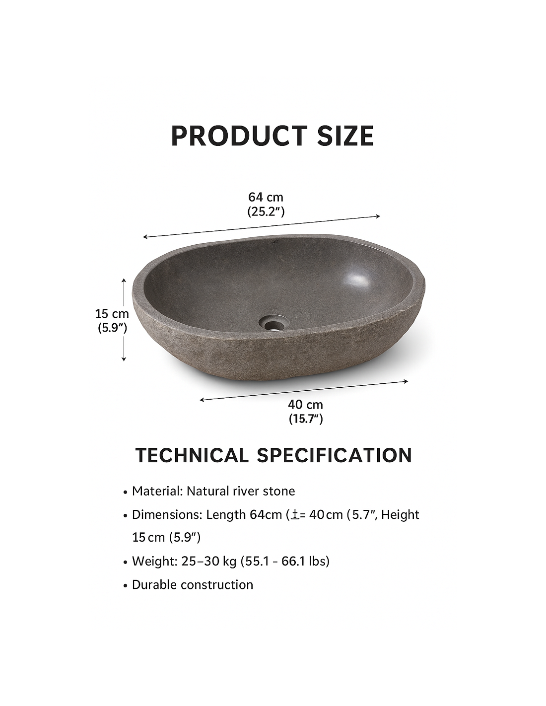 Porta nel tuo bagno l’autenticità della natura con questo lavandino in pietra di fiume naturale da cm 64x40x15, dal peso di circa 25-30 kg. Ogni pezzo è unico, scolpito a mano da un solo blocco di pietra, con una superficie interna levigata e un bordo esterno lasciato grezzo per valorizzare la bellezza autentica della materia prima.