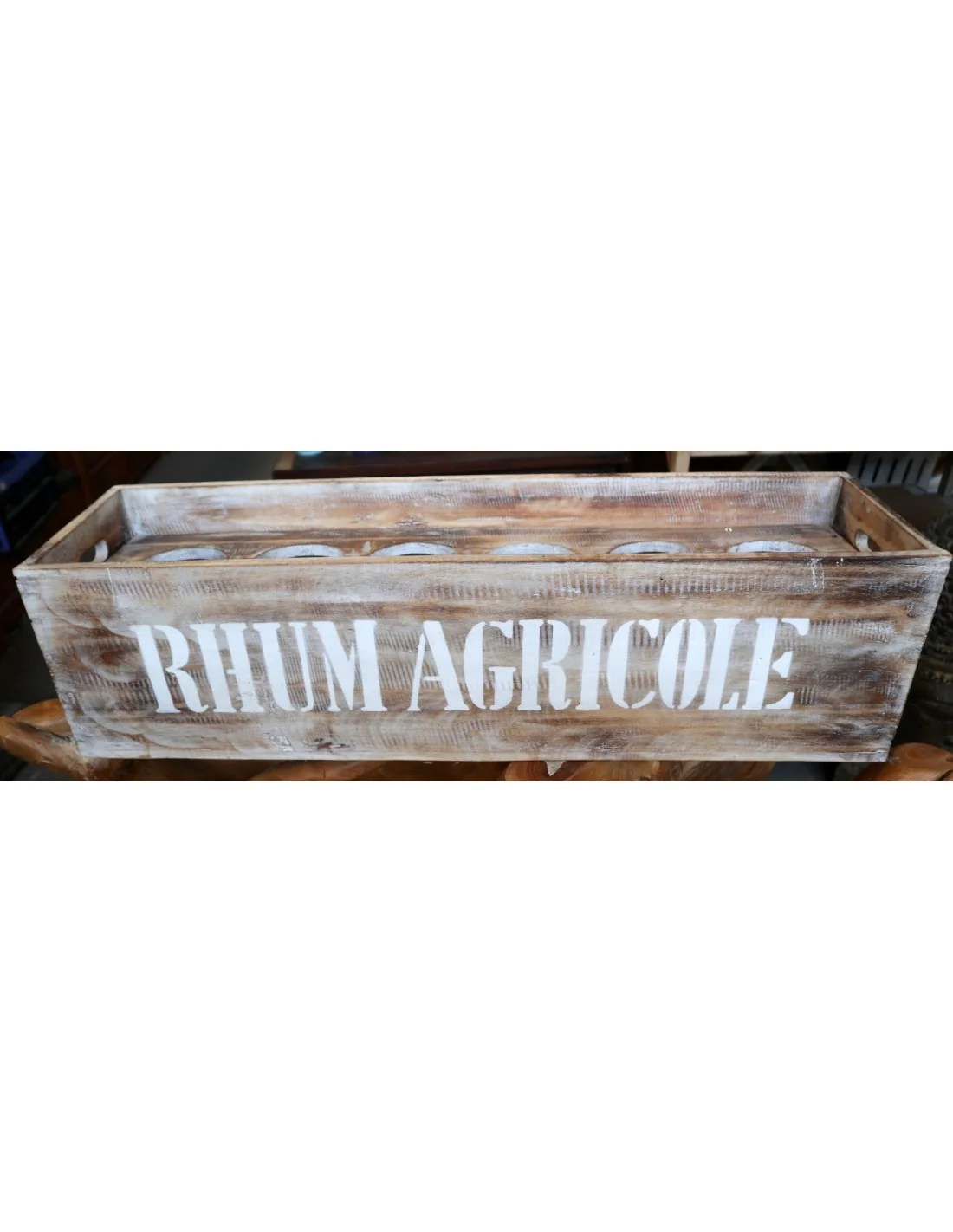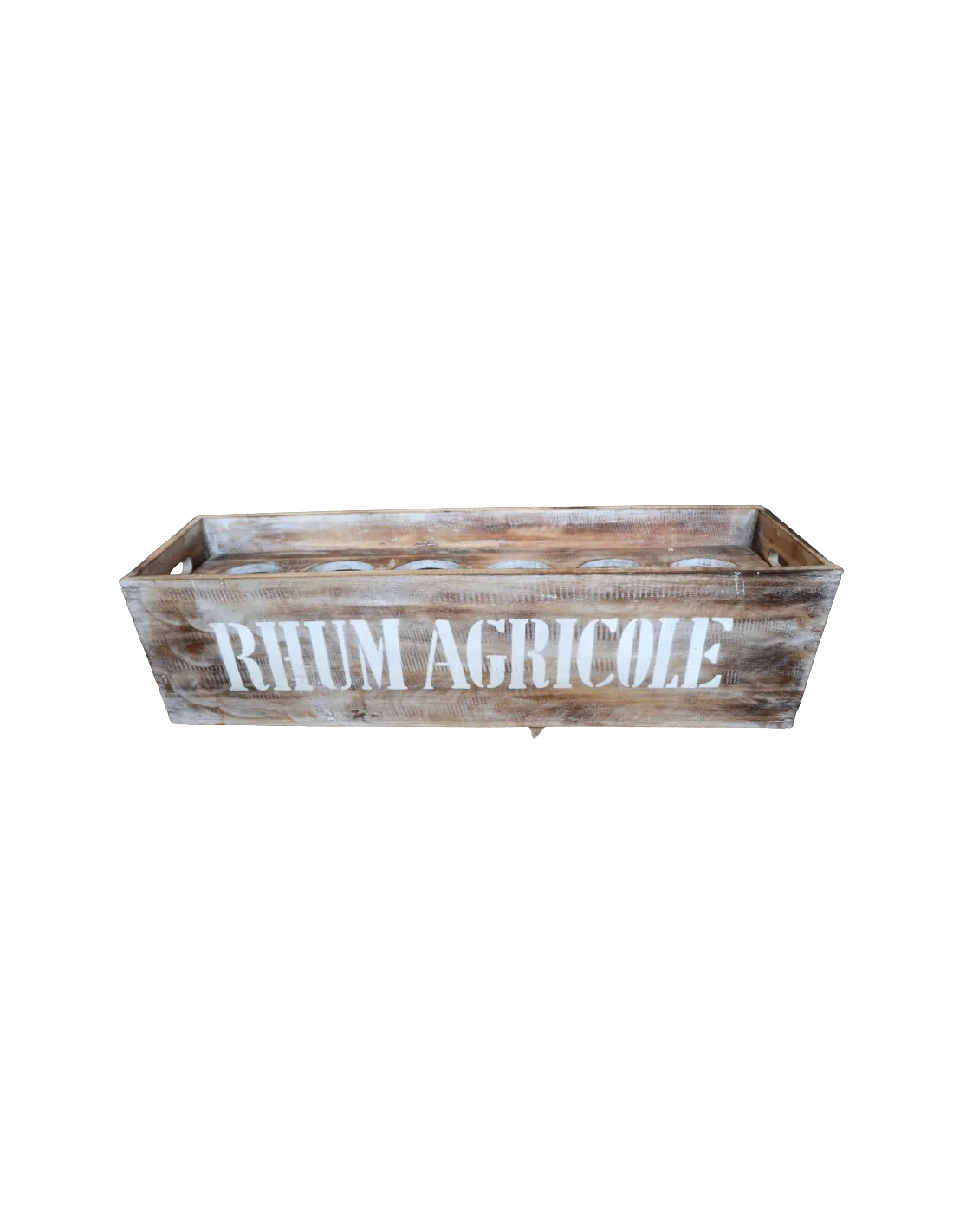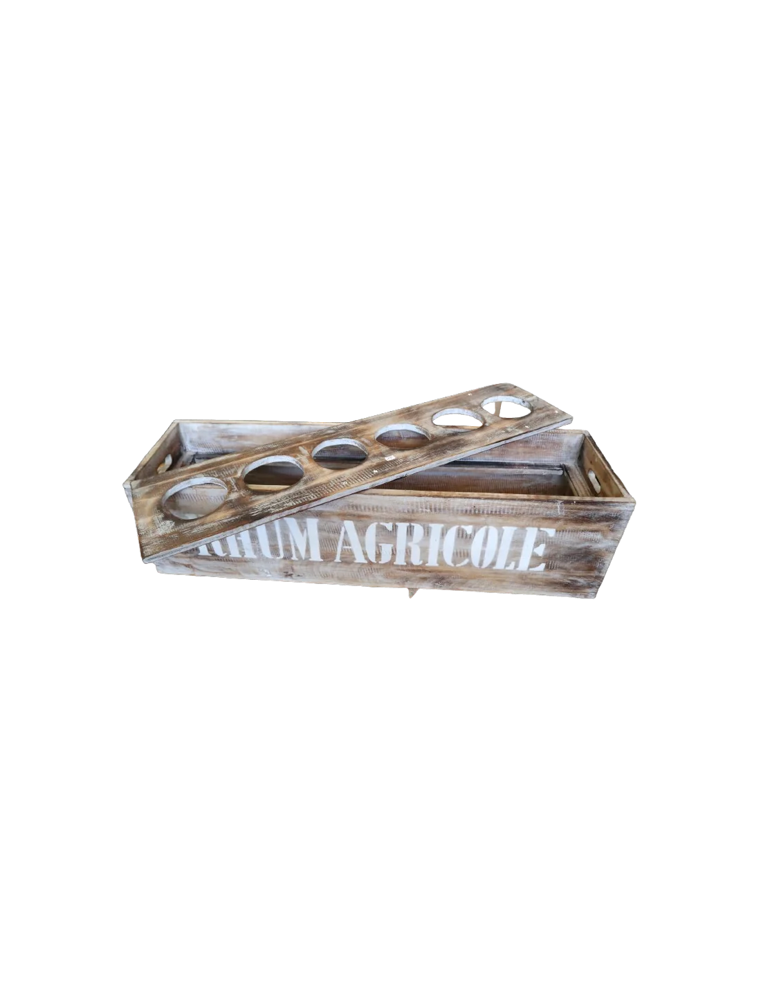 Aggiungi un tocco rustico e autentico ai tuoi ambienti con questa splendida scatola porta bottiglie in legno di albesia, lavorata a mano e ispirata al fascino dei bar coloniali. Con dimensioni generose di 80 x 22 x 22 cm, è perfetta per contenere bottiglie di vino, liquori o rhum in modo pratico ma altamente decorativo. La scritta “RHUM AGRICOLE” in stile stencil vintage, unita alla finitura decapata chiaro/miele, valorizza il legno e dona al pezzo un aspetto vissuto, ideale per ambienti rustici, bistrot, enoteche o cucine dal gusto industriale o retrò. Realizzata artigianalmente in legno di albesia, noto per la sua leggerezza e sostenibilità, questa cassetta è versatile anche come centrotavola, portaoggetti o esposizione da vetrina.
