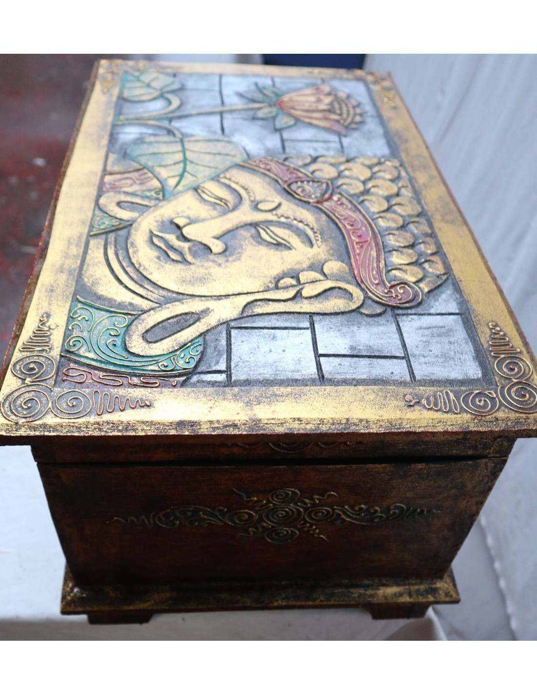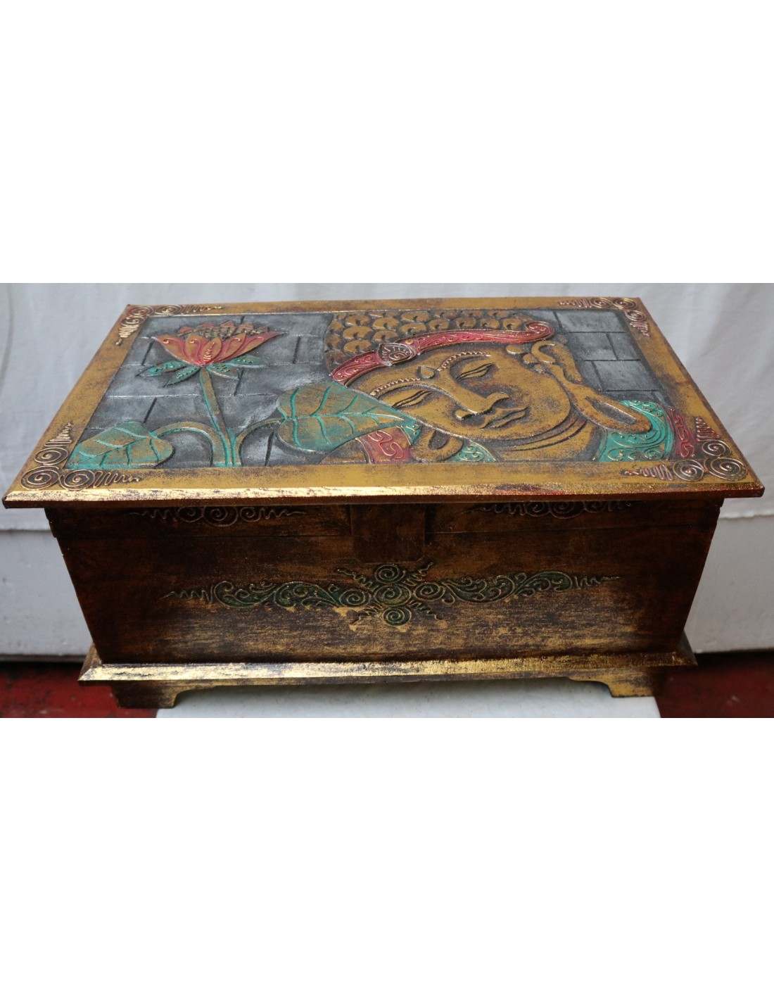 Design Elegante con Volto di Buddha: Il baule cassapanca presenta un design sofisticato impreziosito dal volto di Buddha color oro, aggiungendo un tocco di spiritualità e tranquillità al tuo ambiente. Ogni baule è un'opera d'arte unica, realizzata con attenzione ai dettagli.