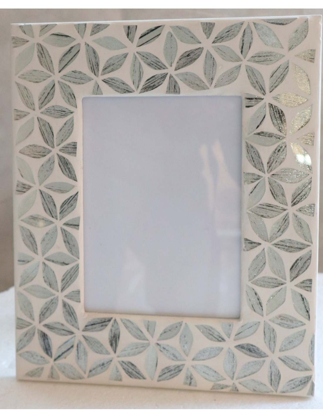 Questa raffinata cornice porta foto combina l'eleganza dei toni argento e bianco con la delicatezza di un mosaico in vetro lavorato a mano. Realizzata in Indonesia su una solida base di legno artigianale, presenta un motivo floreale sofisticato perfetto per qualsiasi ambiente. Ideale per custodire i tuoi ricordi più belli con un tocco di classe e originalità.