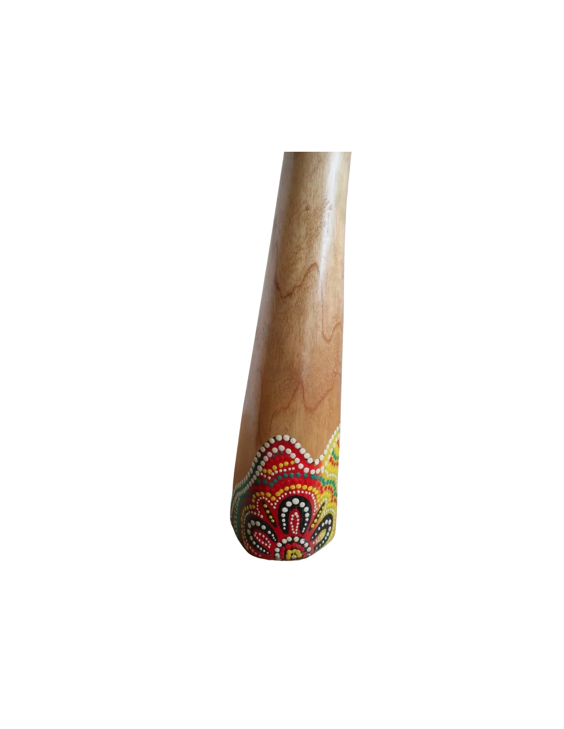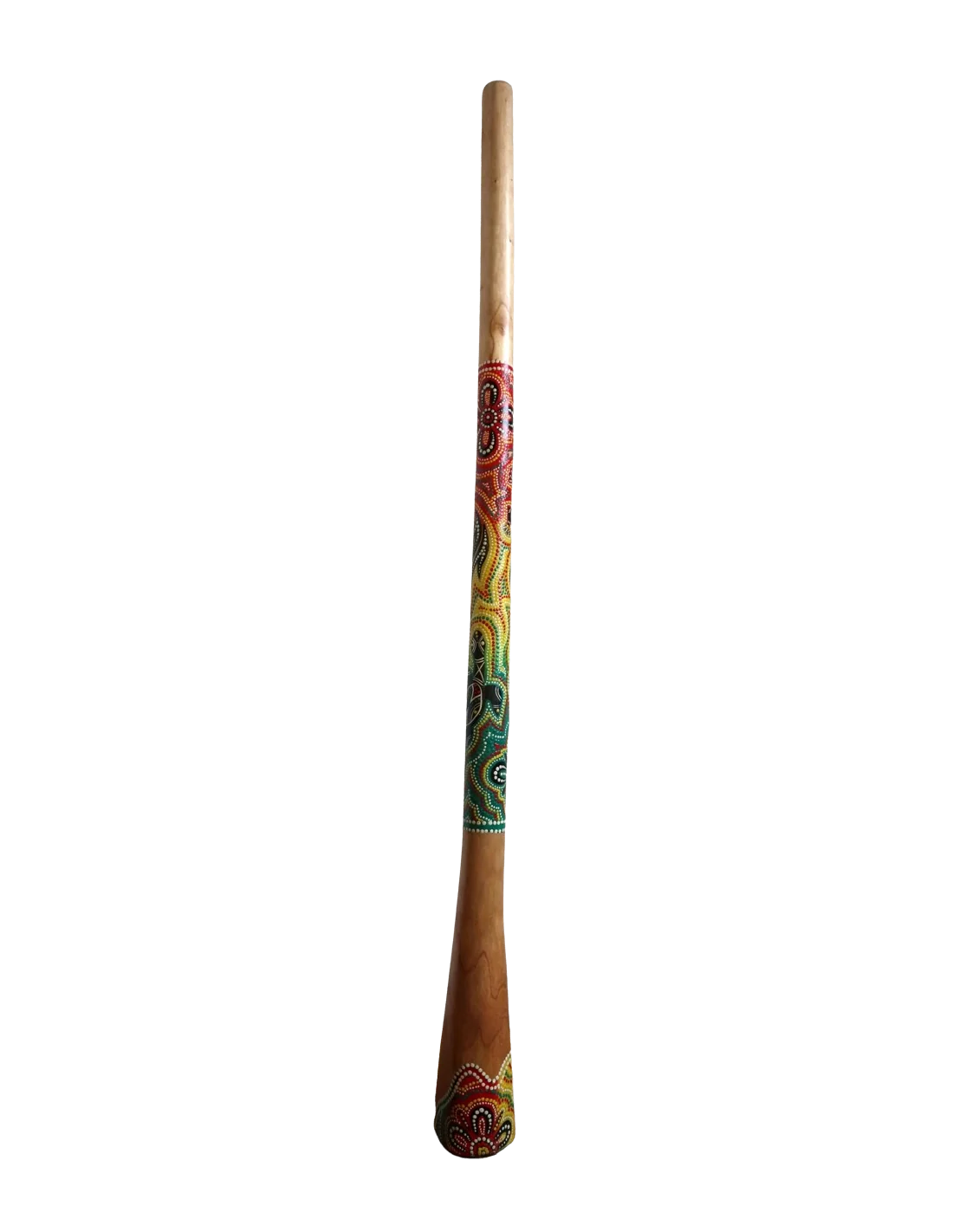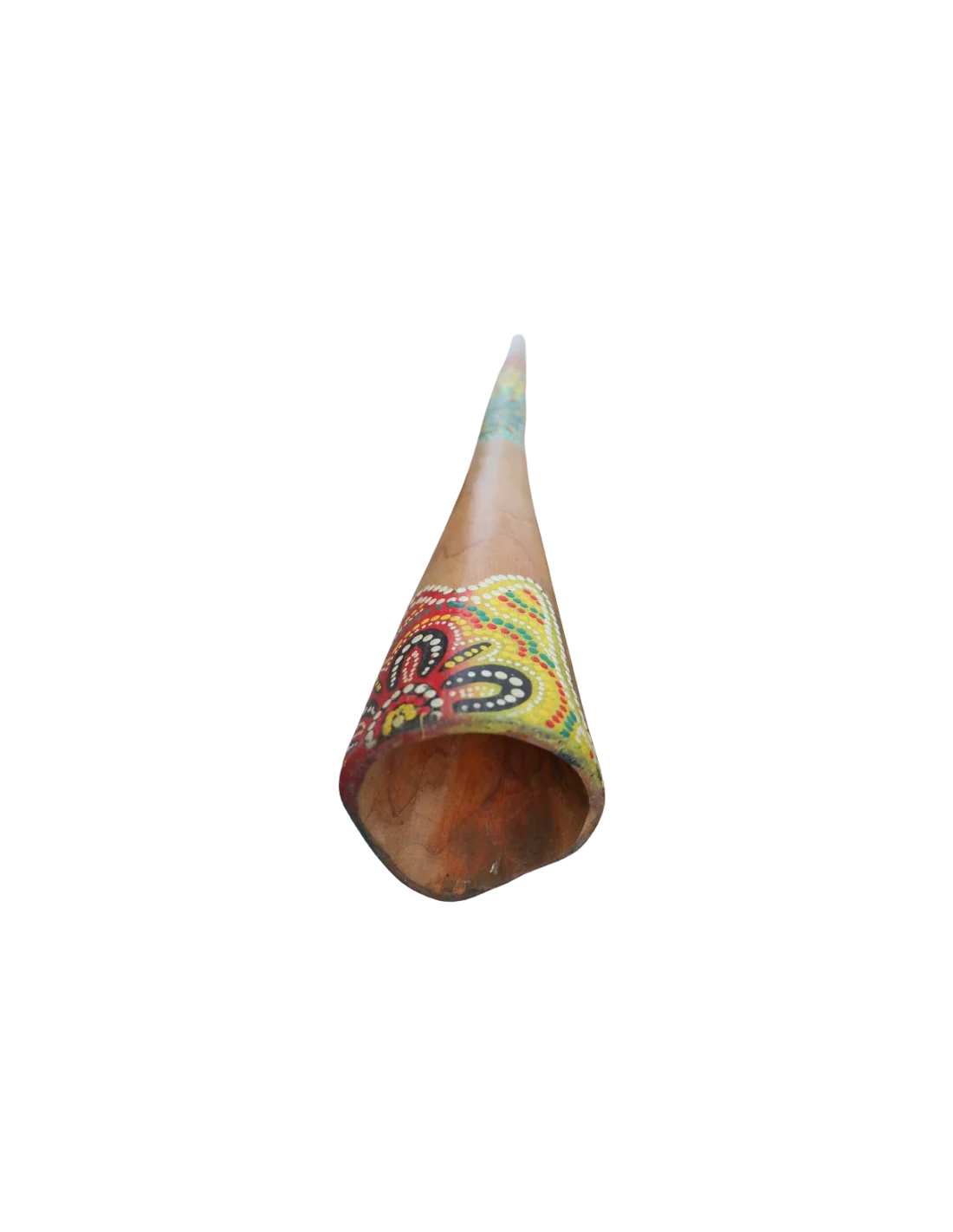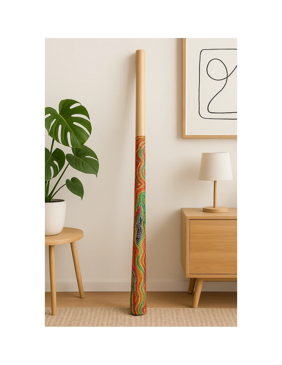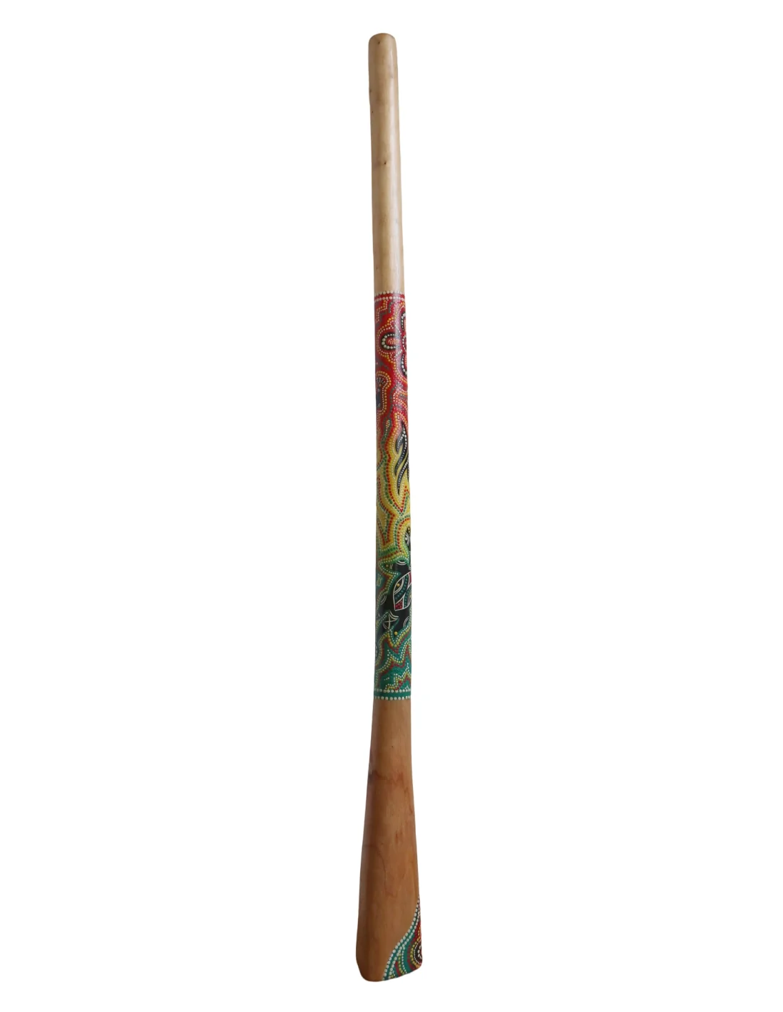 Lo strumento, ispirato alla tradizione dei didgeridoo australiani, presenta una decorazione dipinta a mano con tecnica aborigena, caratterizzata da motivi geometrici e cromie vivaci che lo rendono non solo uno strumento musicale ma anche una vera e propria opera d’arte etnica.