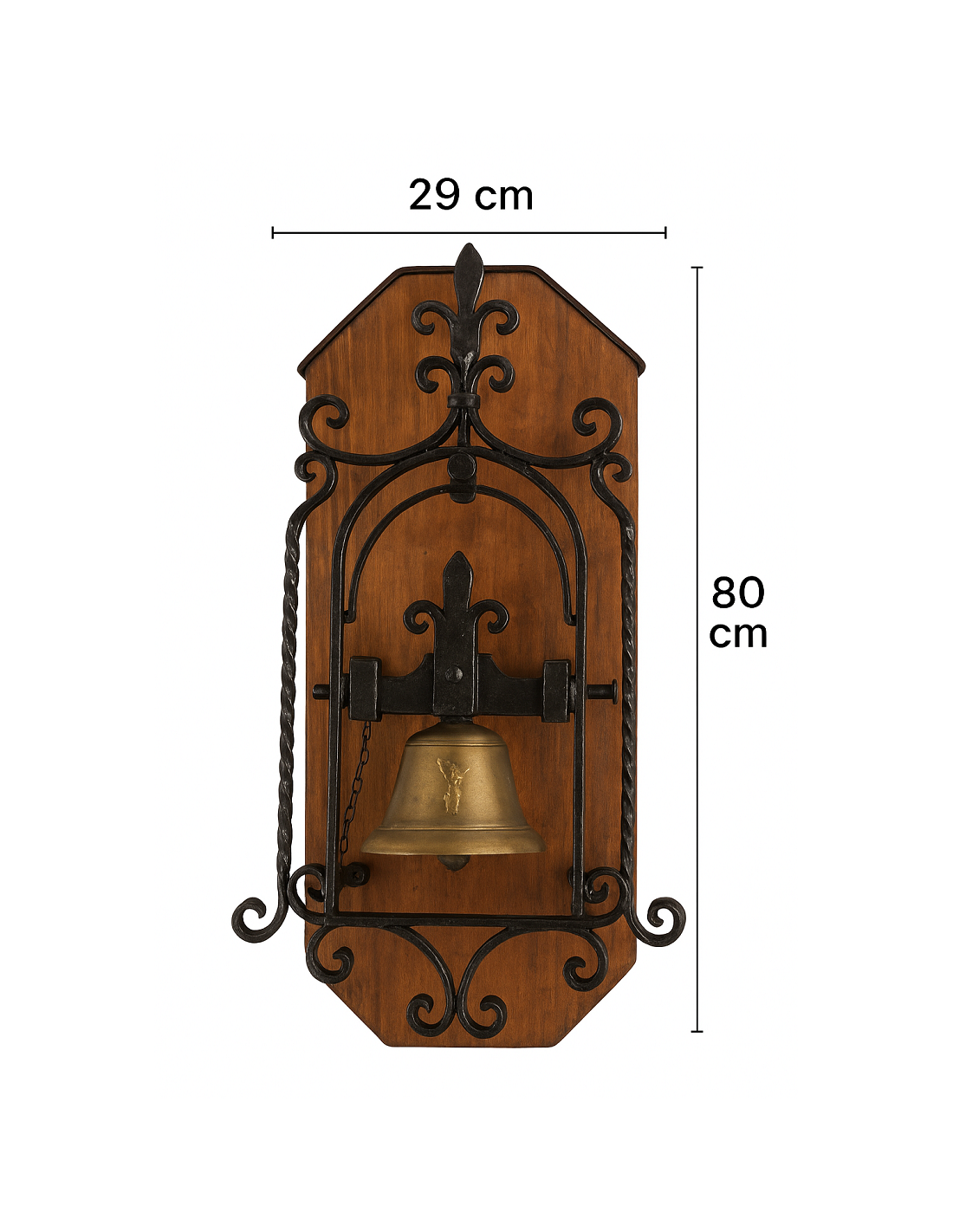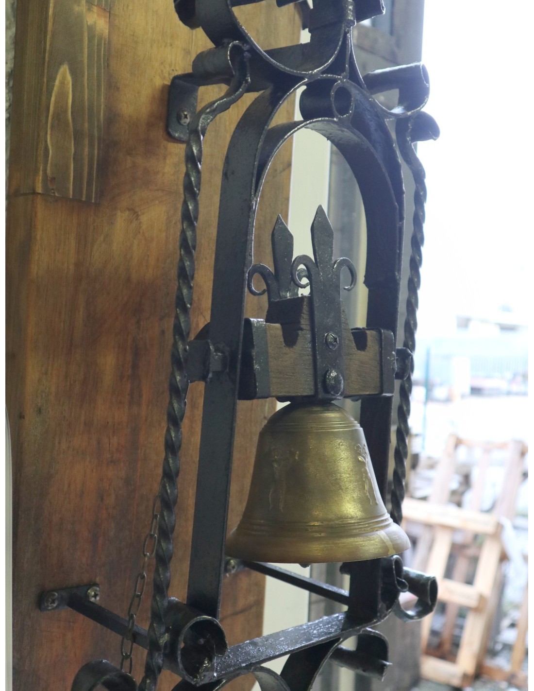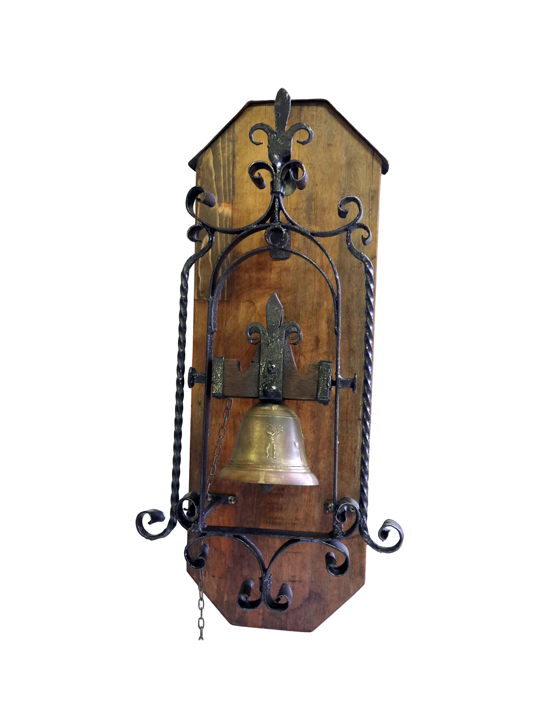 Elegante campana d’ingresso su pa nnello in legno, caratterizzata da una campana in metallo (ottone/bronzo) e da una raffinata cornice in ferro battuto. Le volute e i dettagli lavorati richiamano la lavorazione artigianale tradizionale; il pannello ligneo funge da preziosa base di appoggio che valorizza i contrasti tra metallo e materiale naturale.