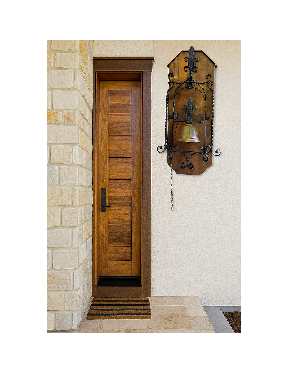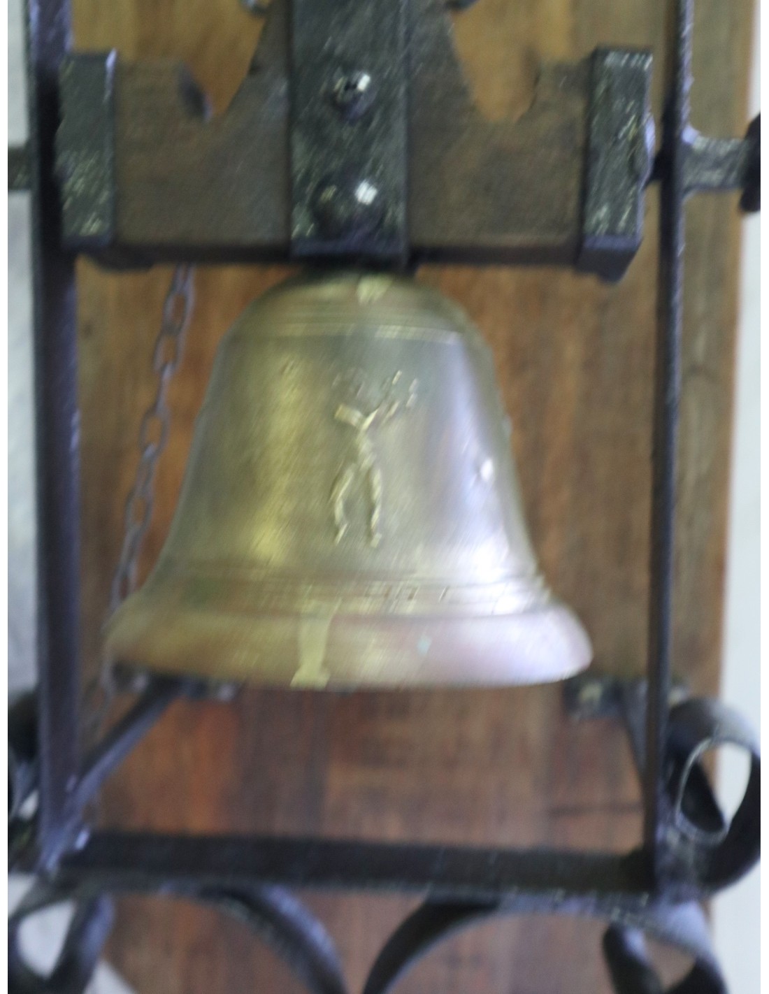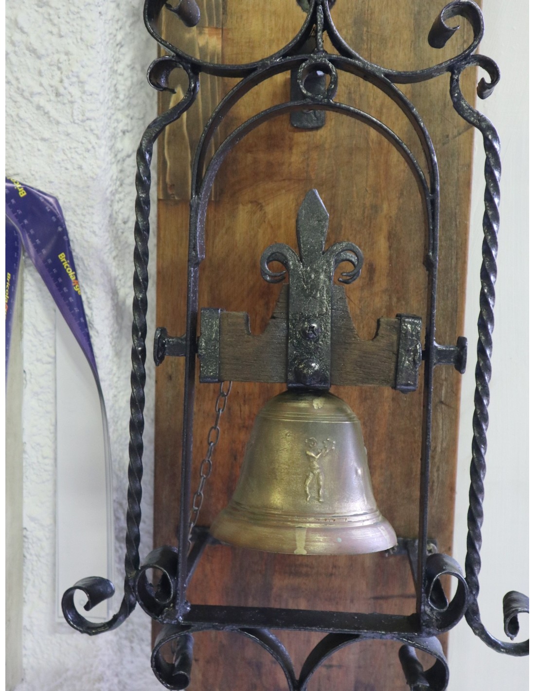 Elegante campana d’ingresso su pa nnello in legno, caratterizzata da una campana in metallo (ottone/bronzo) e da una raffinata cornice in ferro battuto. Le volute e i dettagli lavorati richiamano la lavorazione artigianale tradizionale; il pannello ligneo funge da preziosa base di appoggio che valorizza i contrasti tra metallo e materiale naturale.