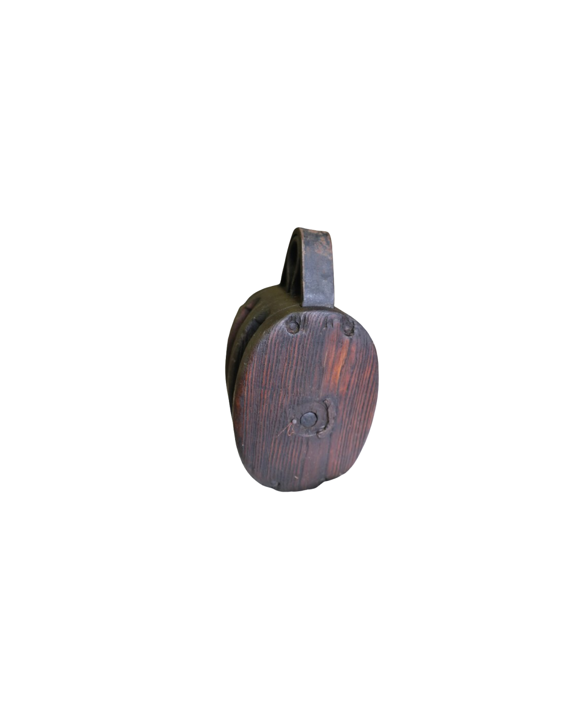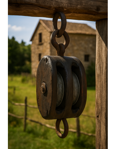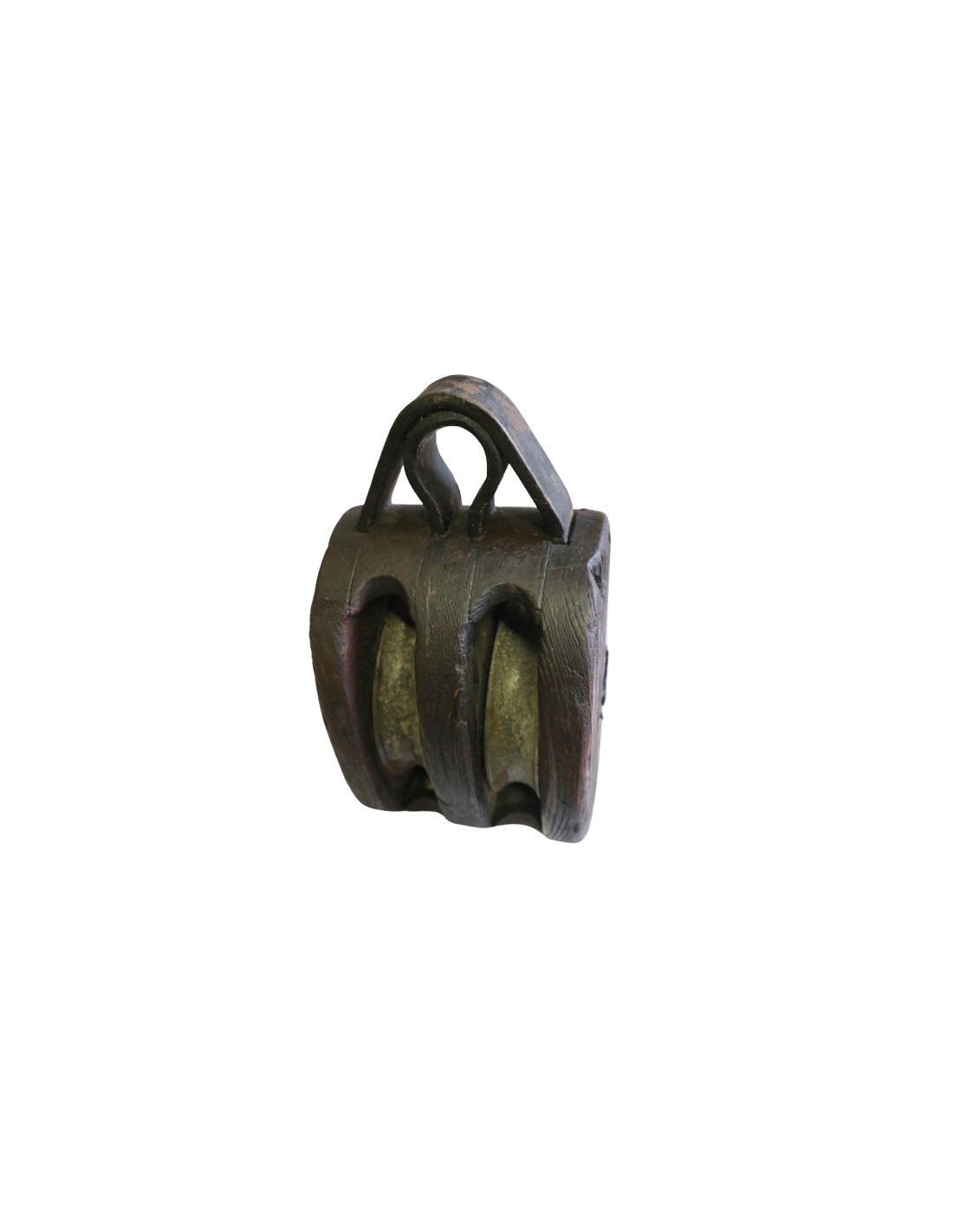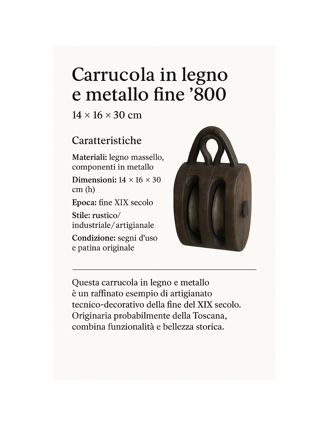 Questa elegante carrucola in legno e metallo rappresenta un raffinato esempio di artigianato tecnico-decorativo della fine del XIX secolo. Realizzata con carezza artigiana — corpo in legno massello sagomato, meccanismo a doppia o tripla ruota in metallo, staffe e ganci forgiati — la carrucola unisce funzionalità e bellezza storica.