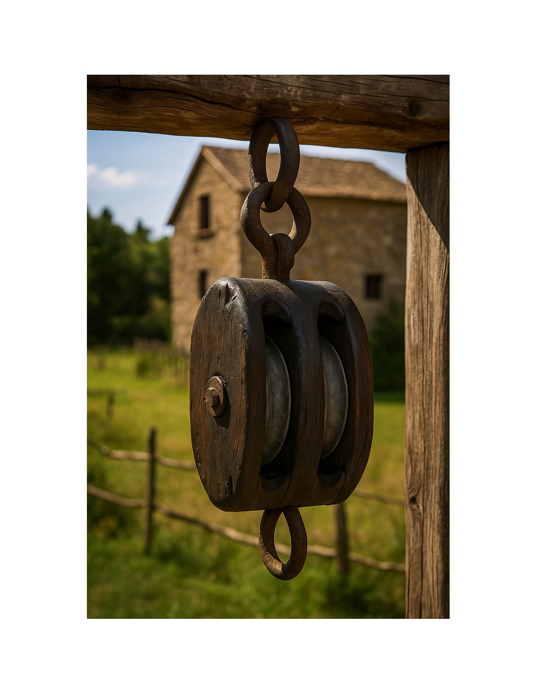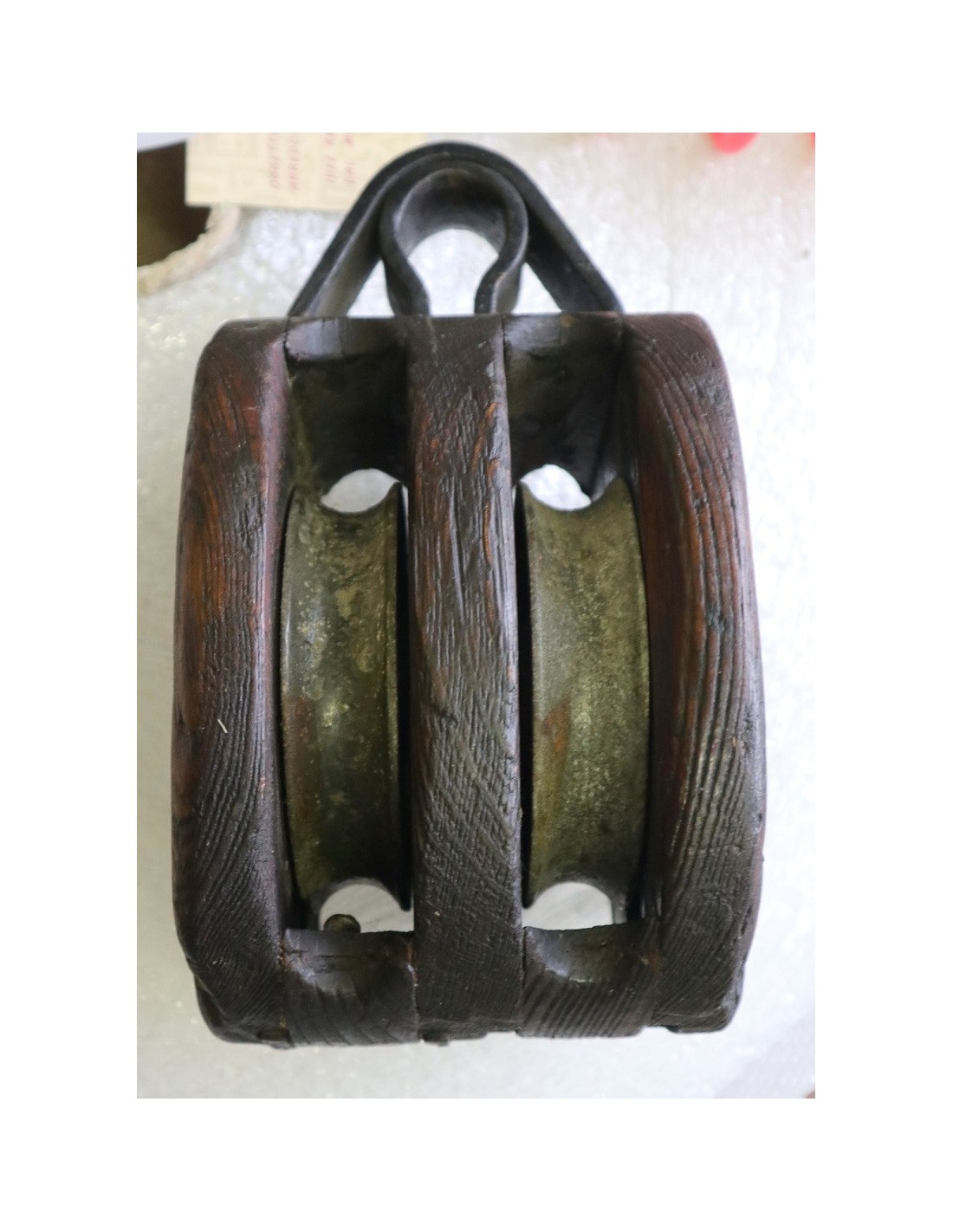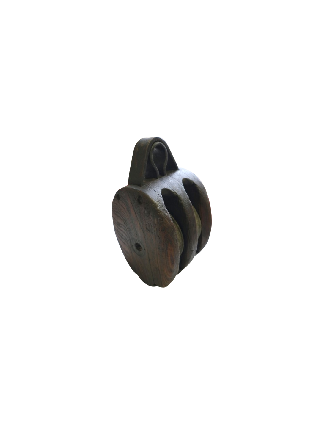 Questa elegante carrucola in legno e metallo rappresenta un raffinato esempio di artigianato tecnico-decorativo della fine del XIX secolo. Realizzata con carezza artigiana — corpo in legno massello sagomato, meccanismo a doppia o tripla ruota in metallo, staffe e ganci forgiati — la carrucola unisce funzionalità e bellezza storica.