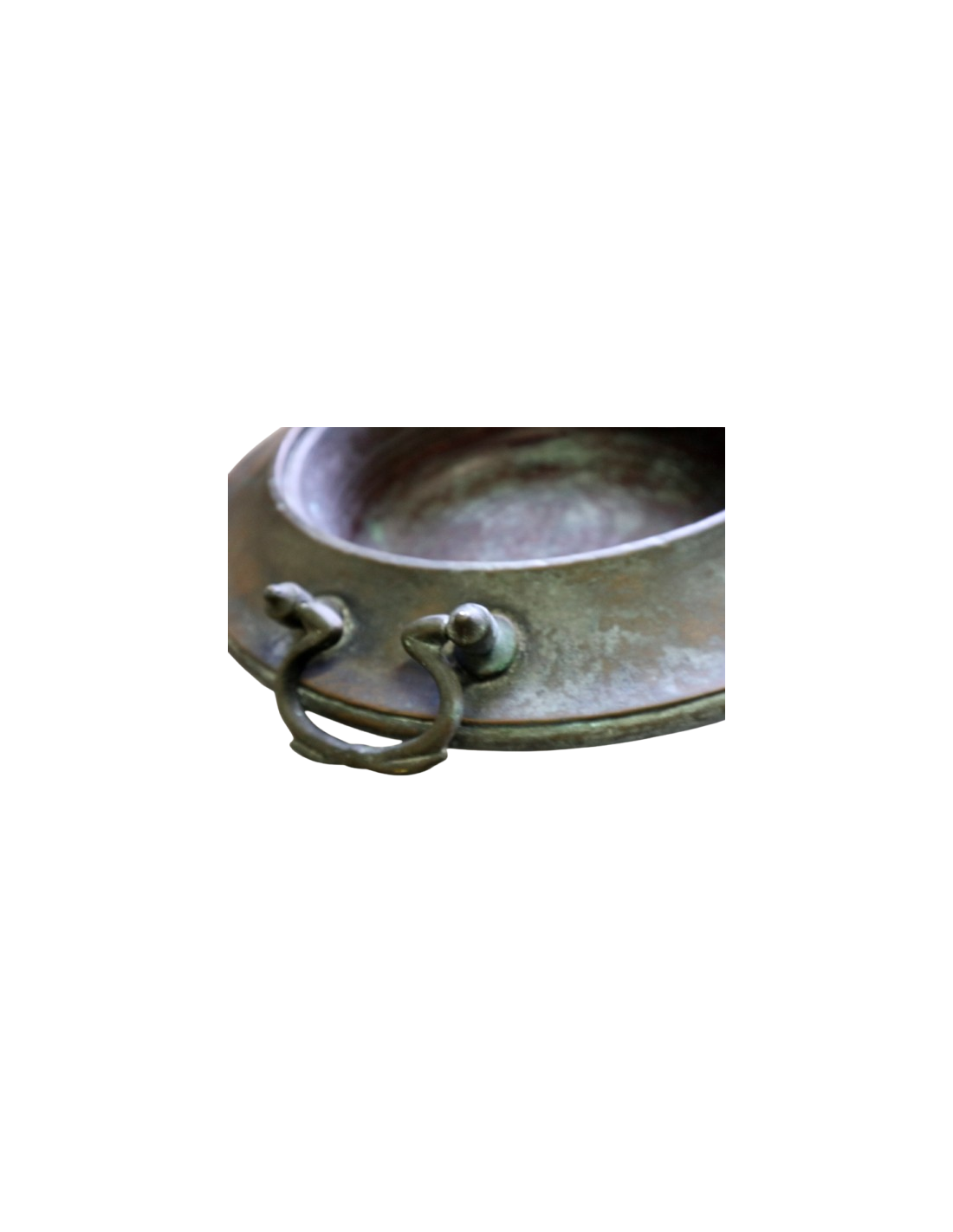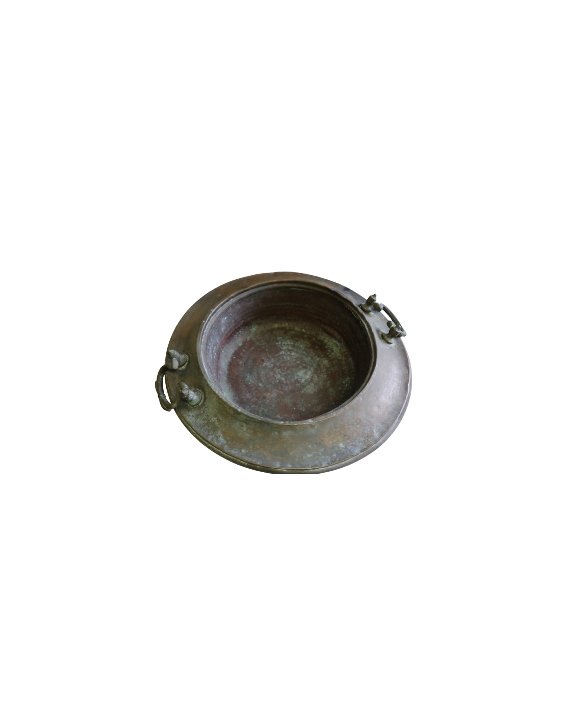 Realizzato interamente in rame massiccio, con una splendida patina naturale del tempo, presenta maniglie laterali forgiate e un foro interno di circa 31 cm di diametro.