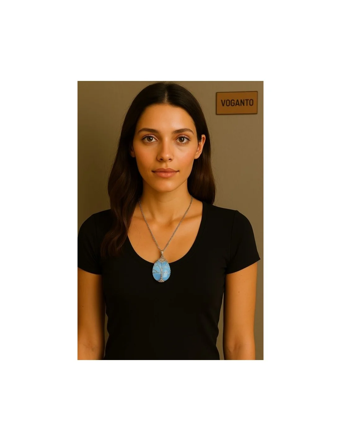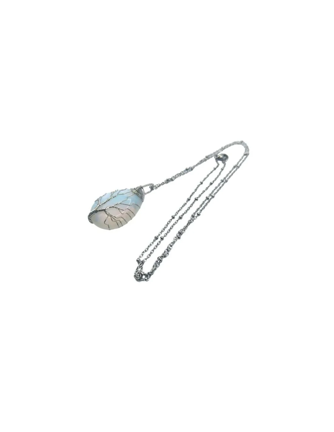 Questo ciondolo a goccia è realizzato con una pietra di Opalite, avvolta da una lavorazione artigianale in filo argentato che disegna l’iconico Albero della Vita, simbolo universale di equilibrio, crescita e connessione tra corpo, mente e spirito.