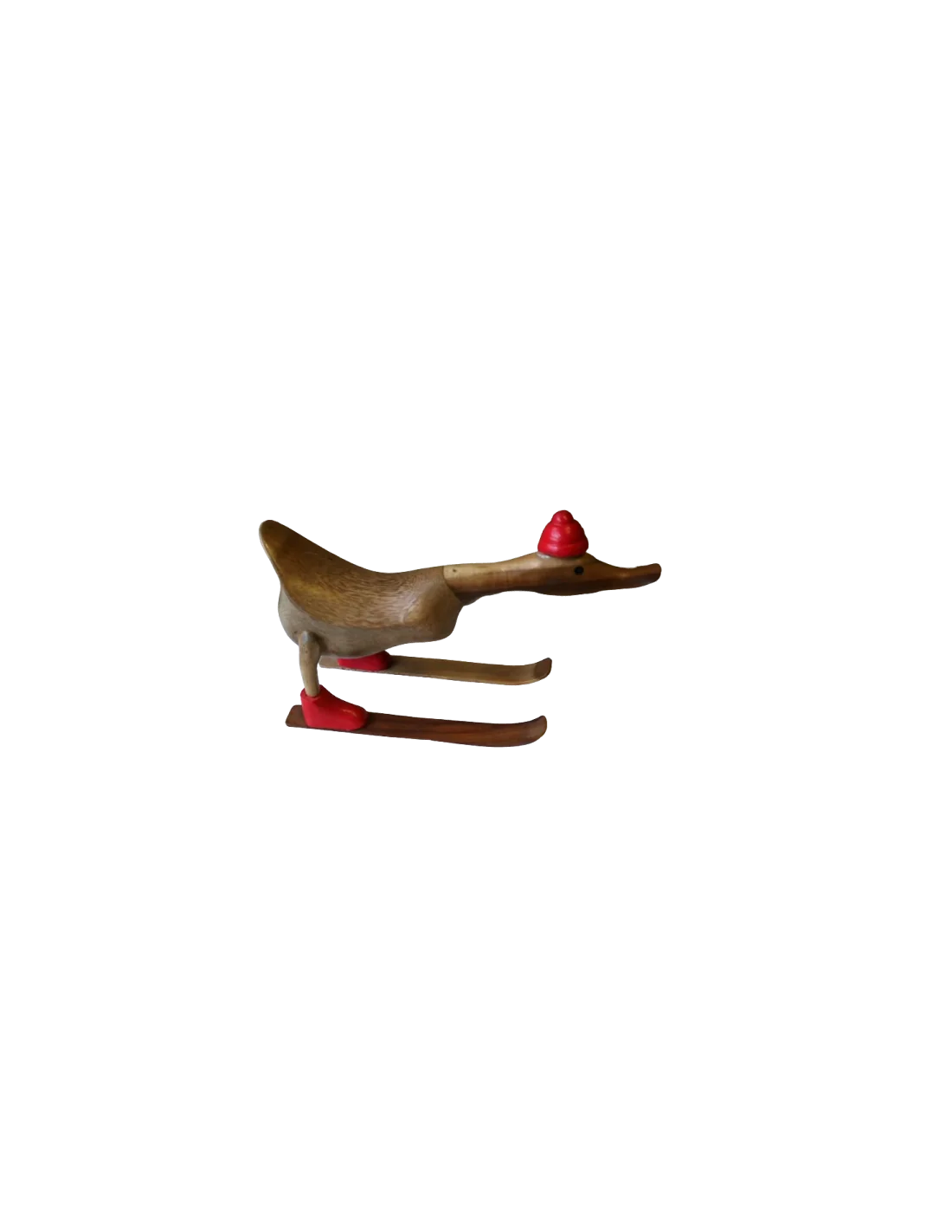 La scultura raffigura una papera in posizione dinamica di discesa, con becco in avanti, come se stesse scivolando sugli sci: un oggetto decorativo originale, ironico ed elegante allo stesso tempo.