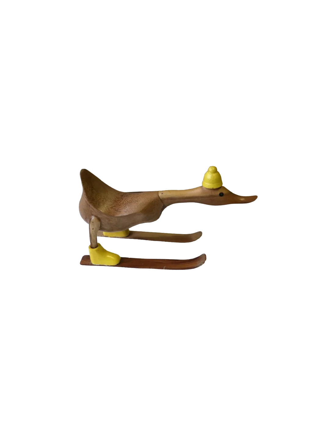 La scultura raffigura una papera in posizione dinamica di discesa, con becco in avanti, come se stesse scivolando sugli sci: un oggetto decorativo originale, ironico ed elegante allo stesso tempo.