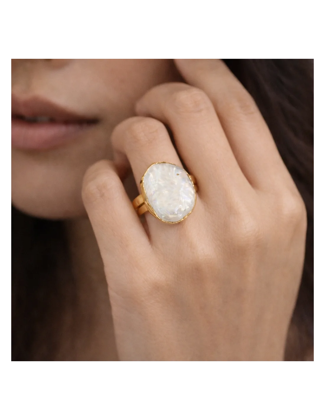 Questo anello regolabile in acciaio con bagno galvanico in oro è una creazione raffinata e luminosa, impreziosita da una madreperla naturale lasciata grezza, scelta per preservarne l’autenticità e la bellezza originaria.