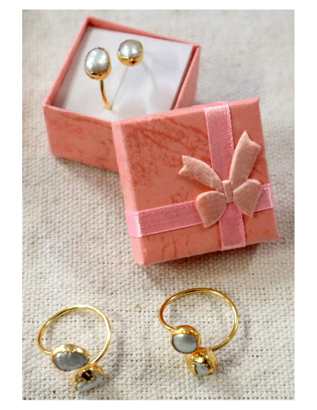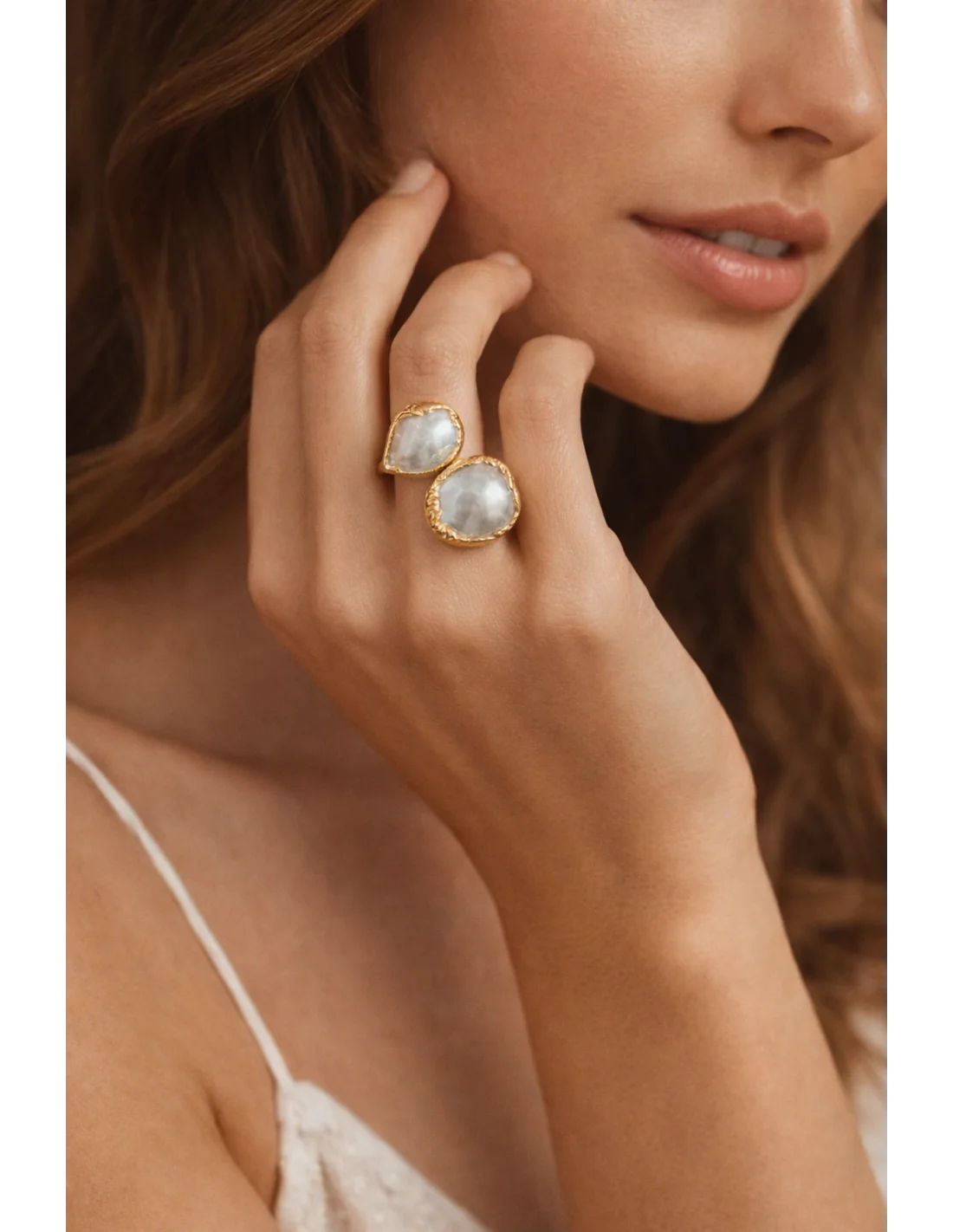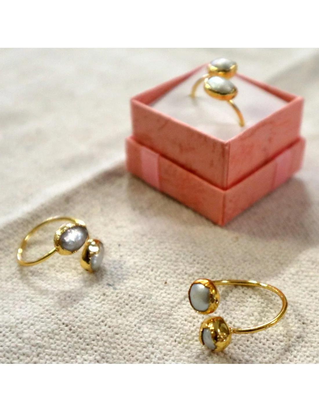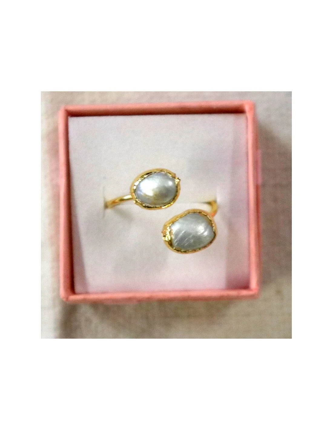 Questo anello regolabile in acciaio con bagno galvanico in oro è impreziosito da due autentiche madreperle grezze, ciascuna diversa dall’altra, rendendo ogni pezzo unico e irripetibile.