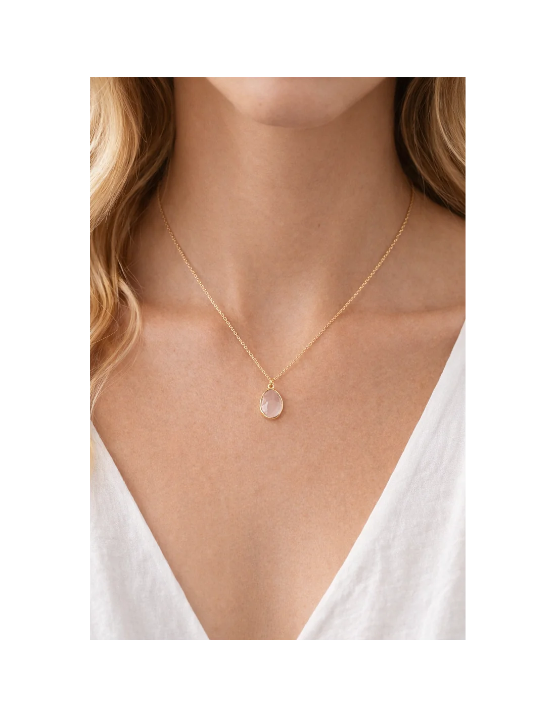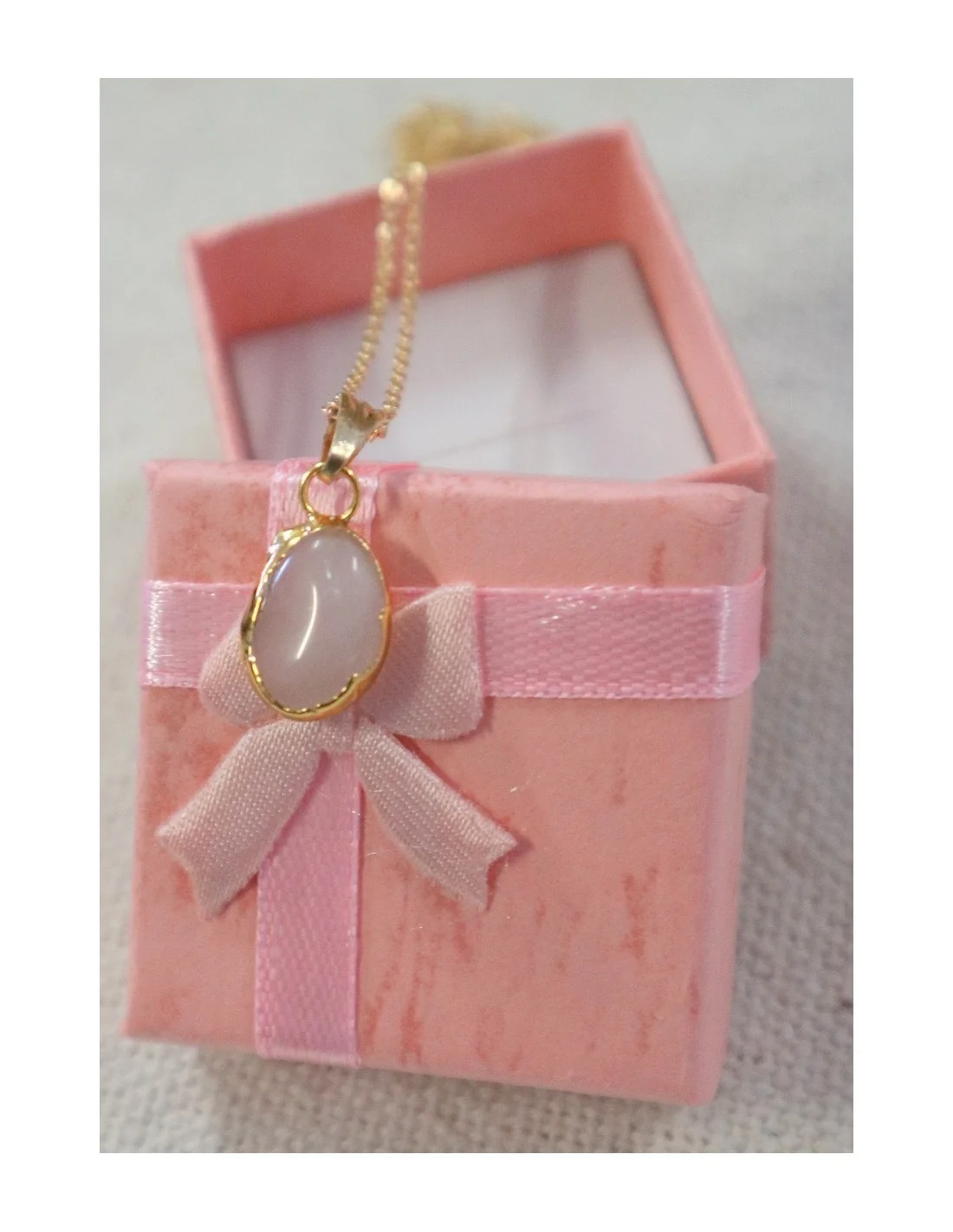 Il ciondolo, incastonato a mano, esalta la dolce tonalità rosata della pietra naturale, simbolo universale di amore, armonia e femminilità.