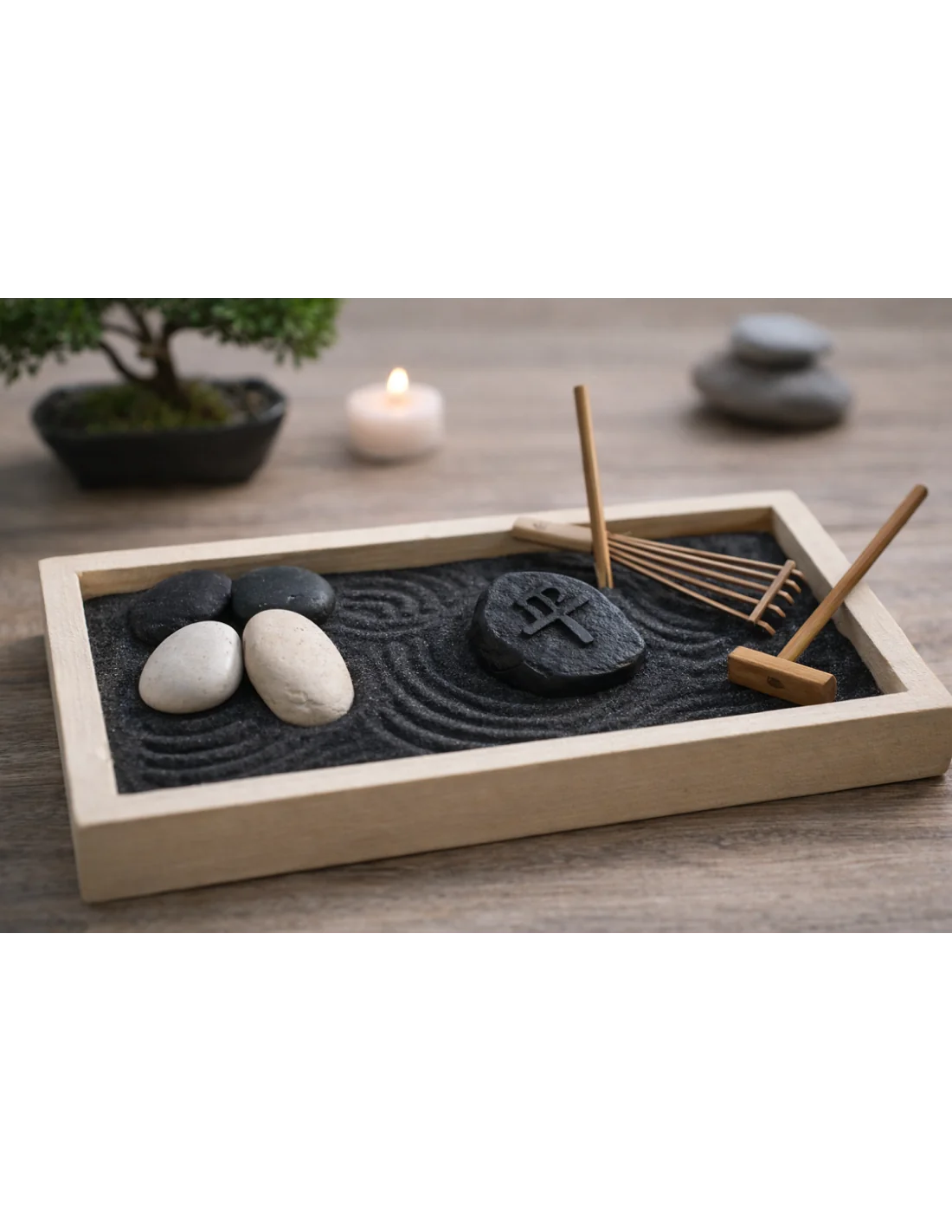 Realizzato con base in pietra , questo mini giardino zen unisce spiritualità, artigianalità e design naturale. Ogni pezzo è unico: eventuali piccole imperfezioni sono da considerarsi un pregio, testimonianza dell’autenticità del lavoro manuale.