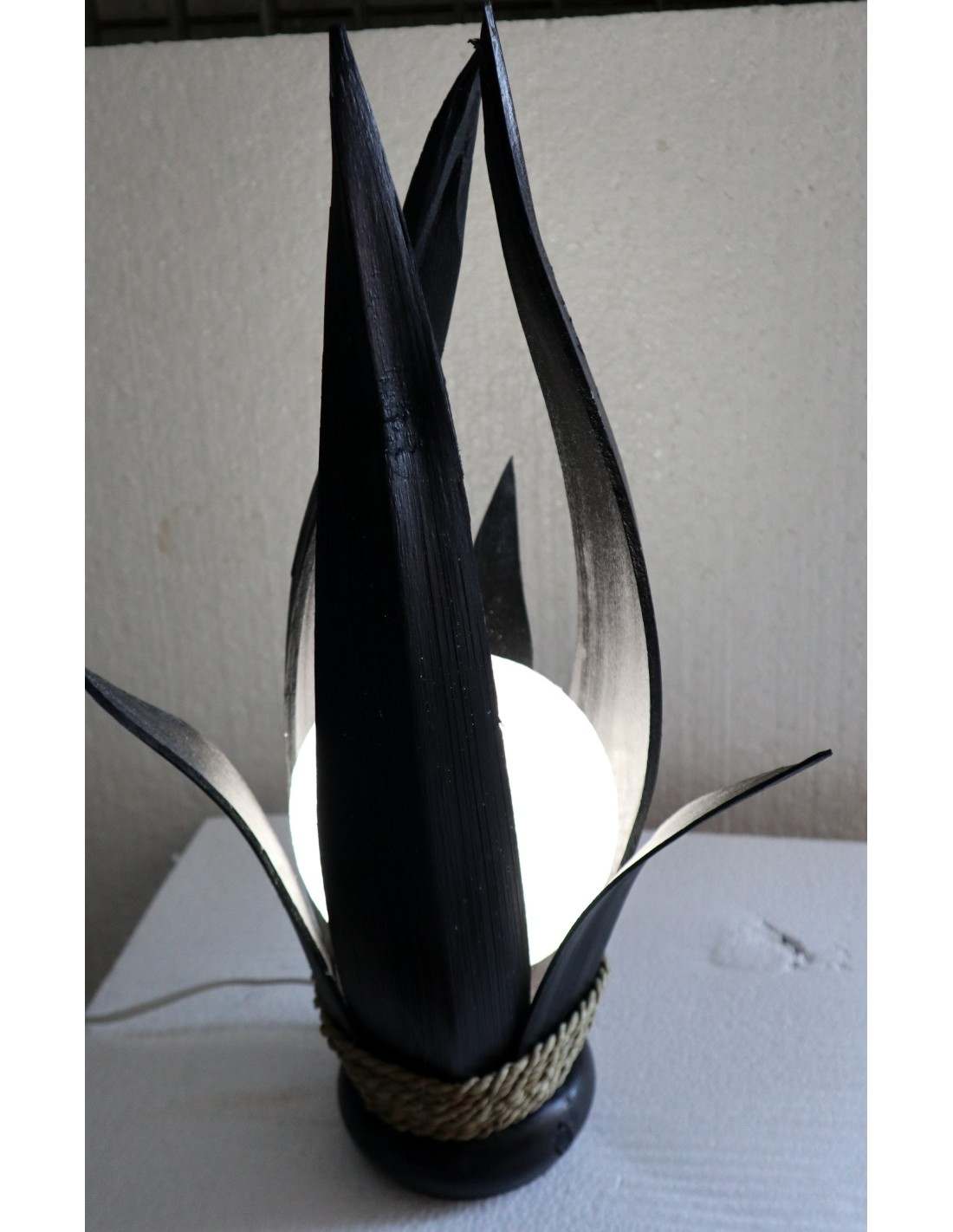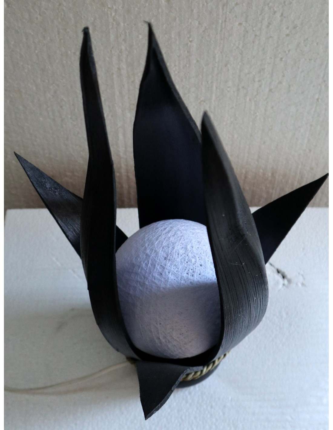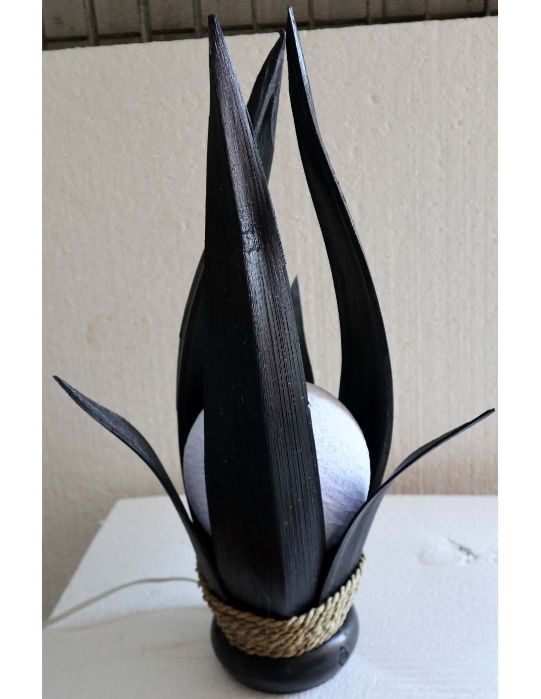 Questa esclusiva lampada abat-jour artigianale è realizzata con foglie di cocco naturale lavorato a mano e rifinito in nero opaco, che avvolgono elegantemente una sfera di cotone bianca.