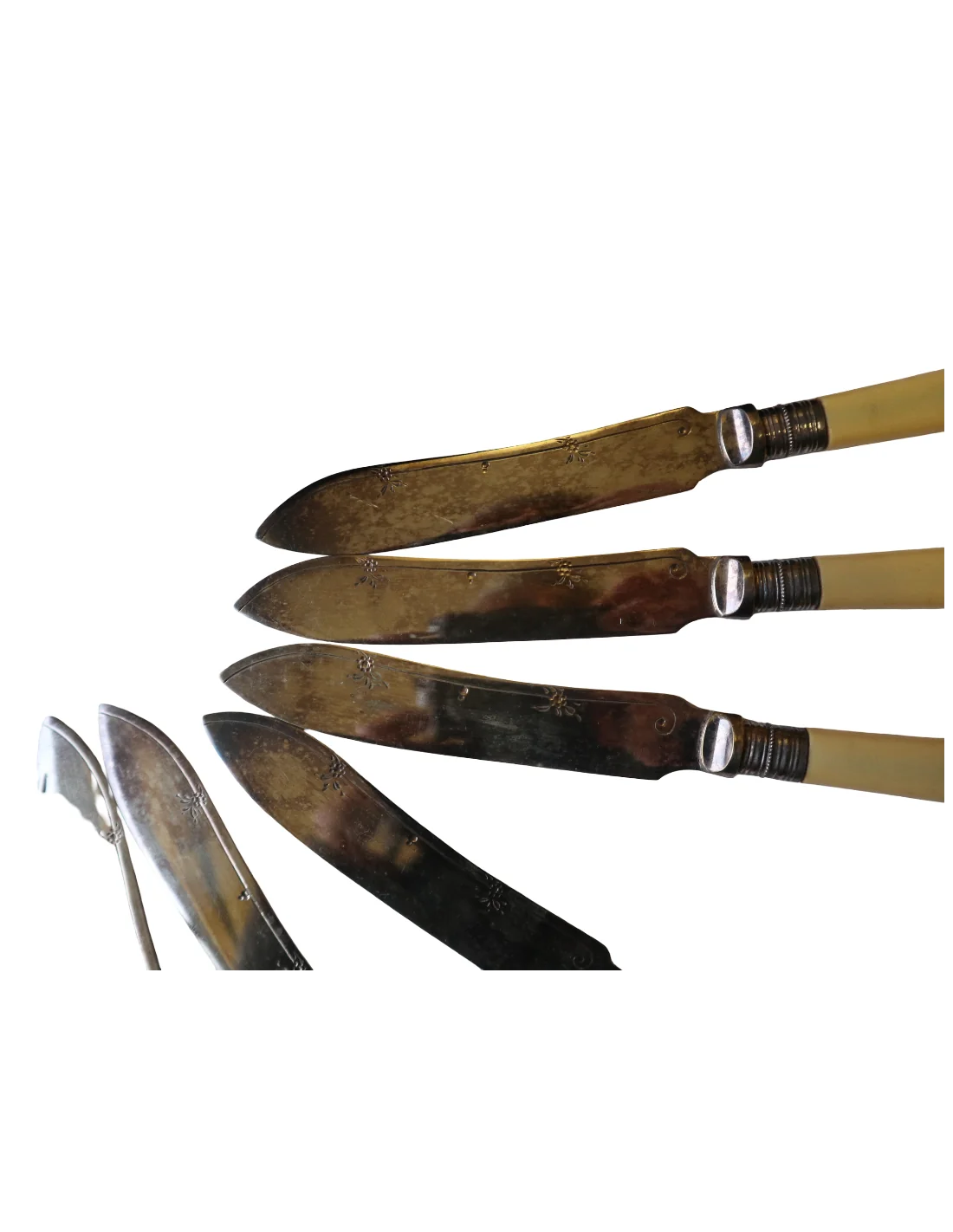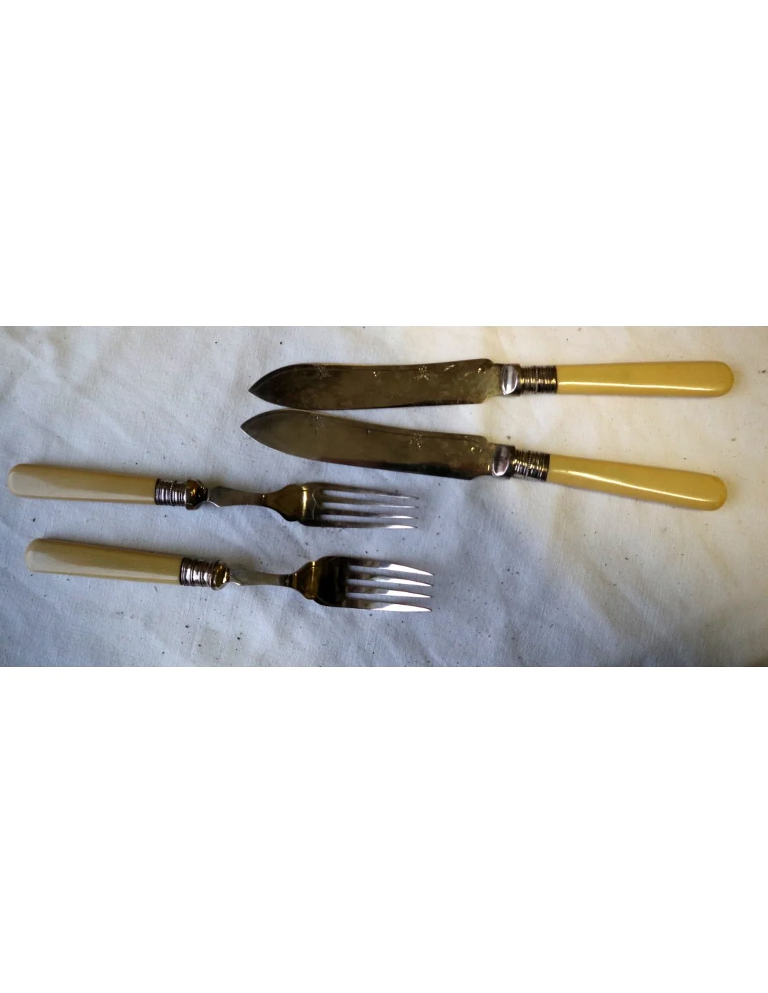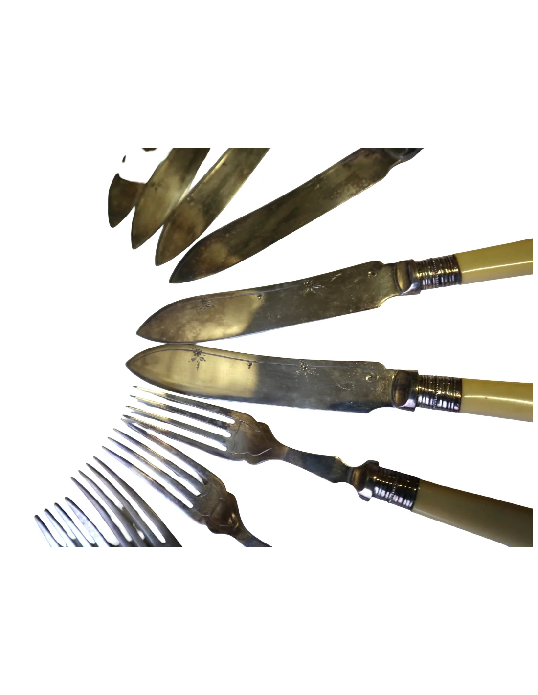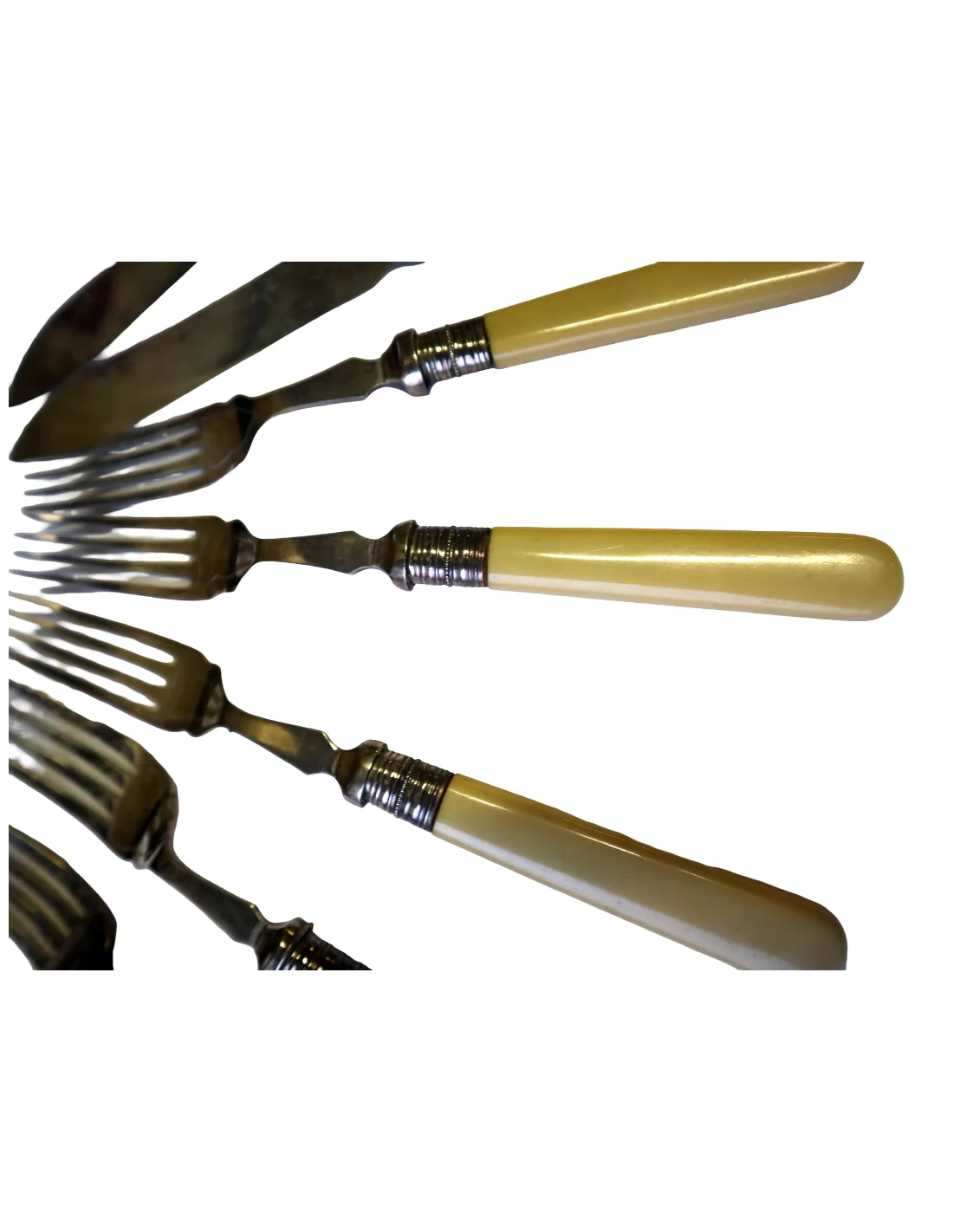 I manici, dal tipico colore caldo avorio, potrebbero essere realizzati in osso lucidato oppure in una delle prime resine sintetiche dell’epoca (come celluloide o galalite), materiali molto utilizzati tra fine ‘800 e inizio ‘900 per oggetti di pregio domestico.