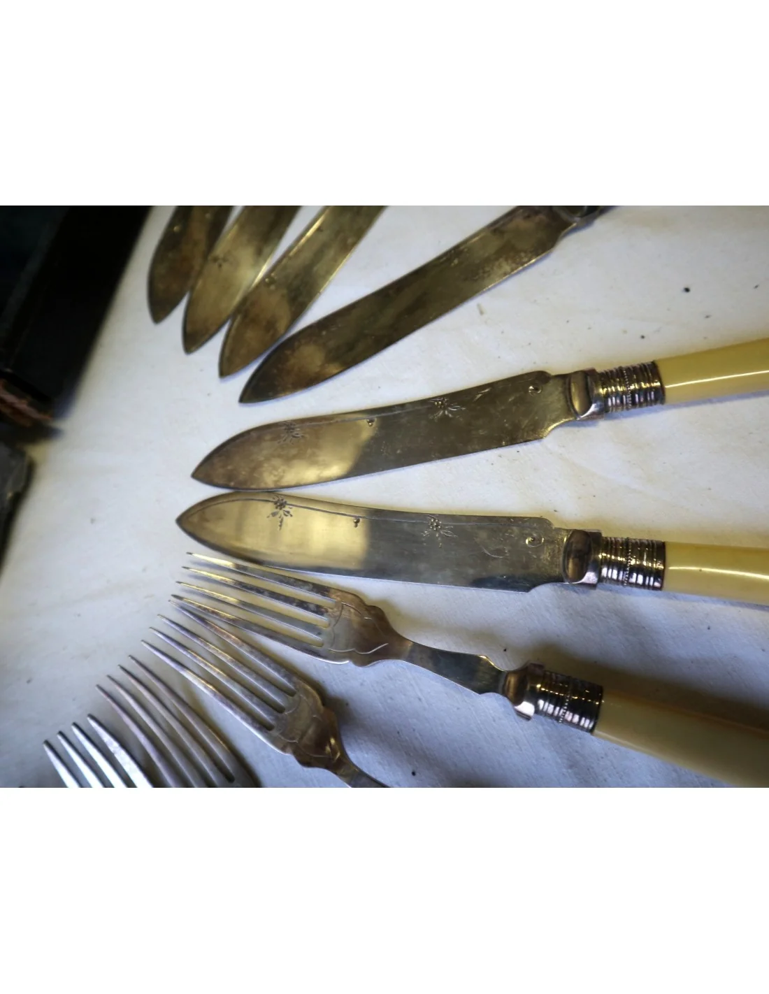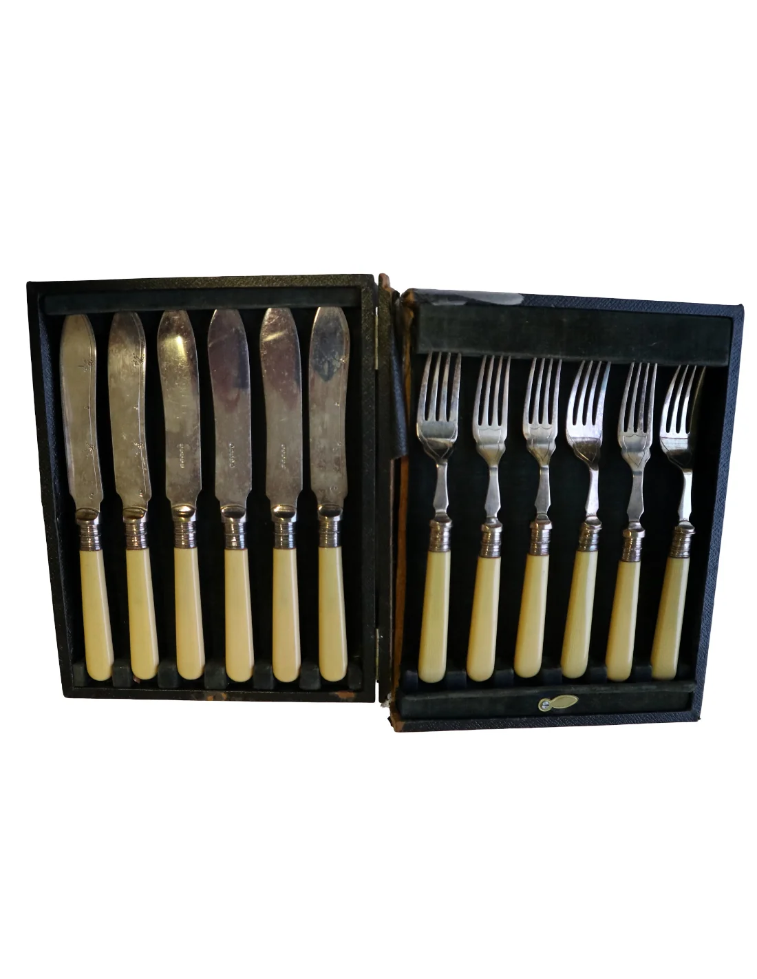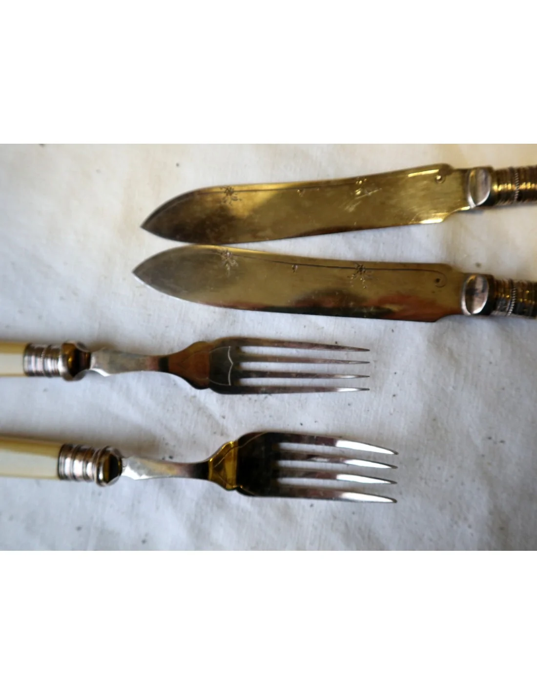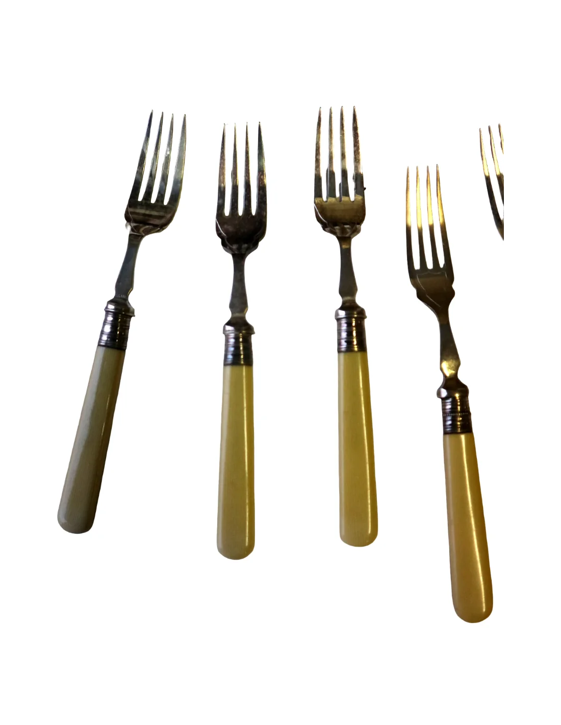 I manici, dal tipico colore caldo avorio, potrebbero essere realizzati in osso lucidato oppure in una delle prime resine sintetiche dell’epoca (come celluloide o galalite), materiali molto utilizzati tra fine ‘800 e inizio ‘900 per oggetti di pregio domestico.