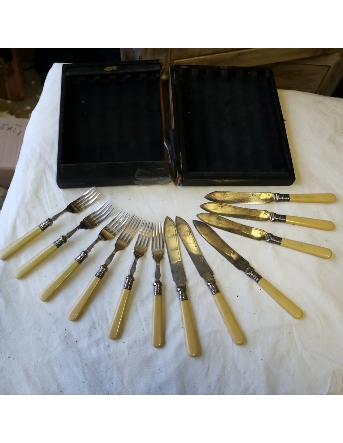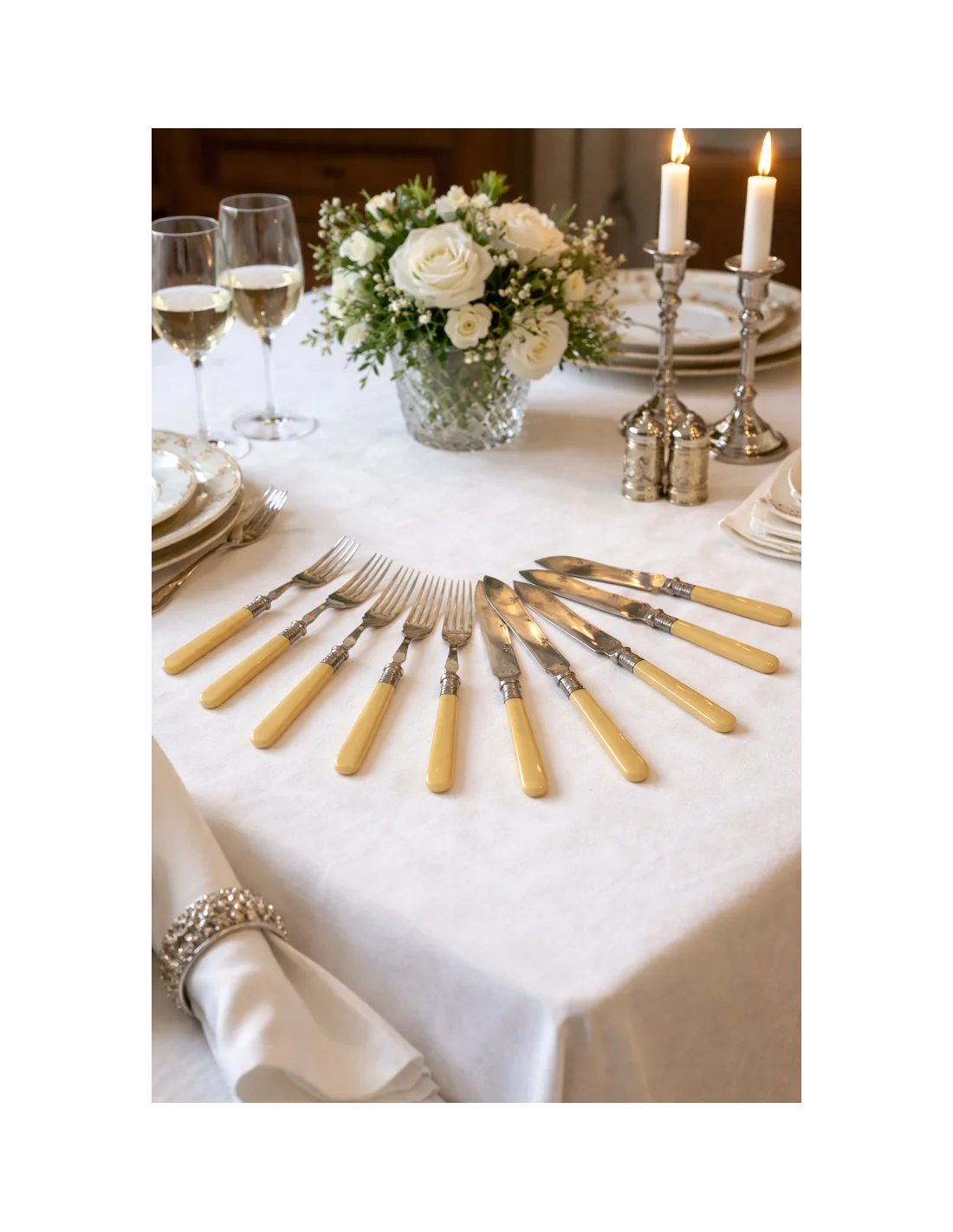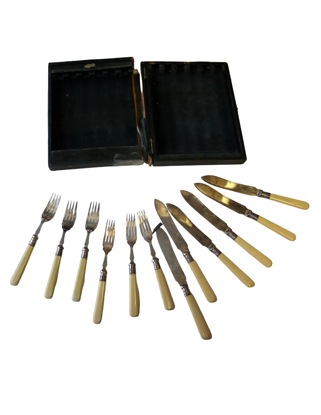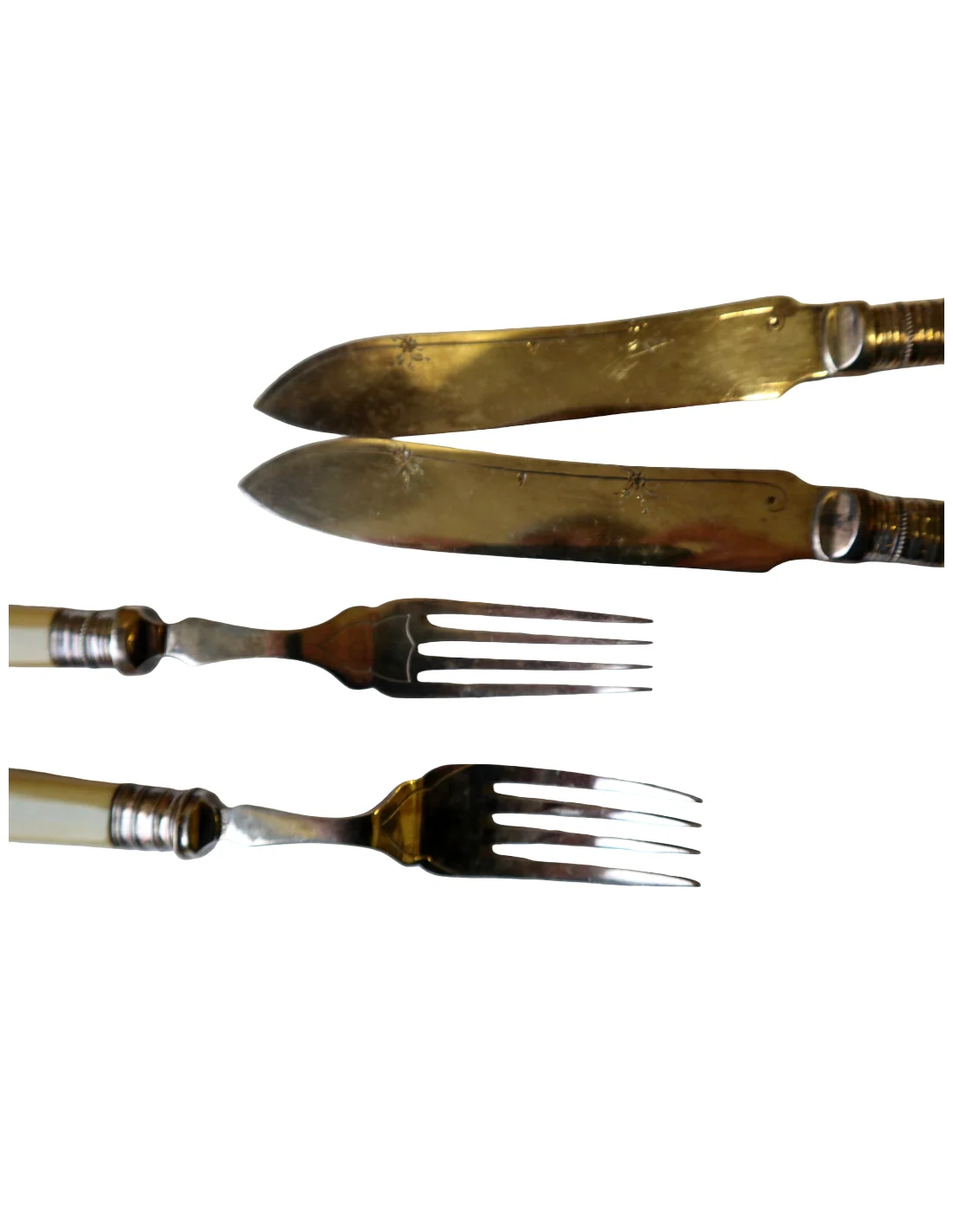 I manici, dal tipico colore caldo avorio, potrebbero essere realizzati in osso lucidato oppure in una delle prime resine sintetiche dell’epoca (come celluloide o galalite), materiali molto utilizzati tra fine ‘800 e inizio ‘900 per oggetti di pregio domestico.