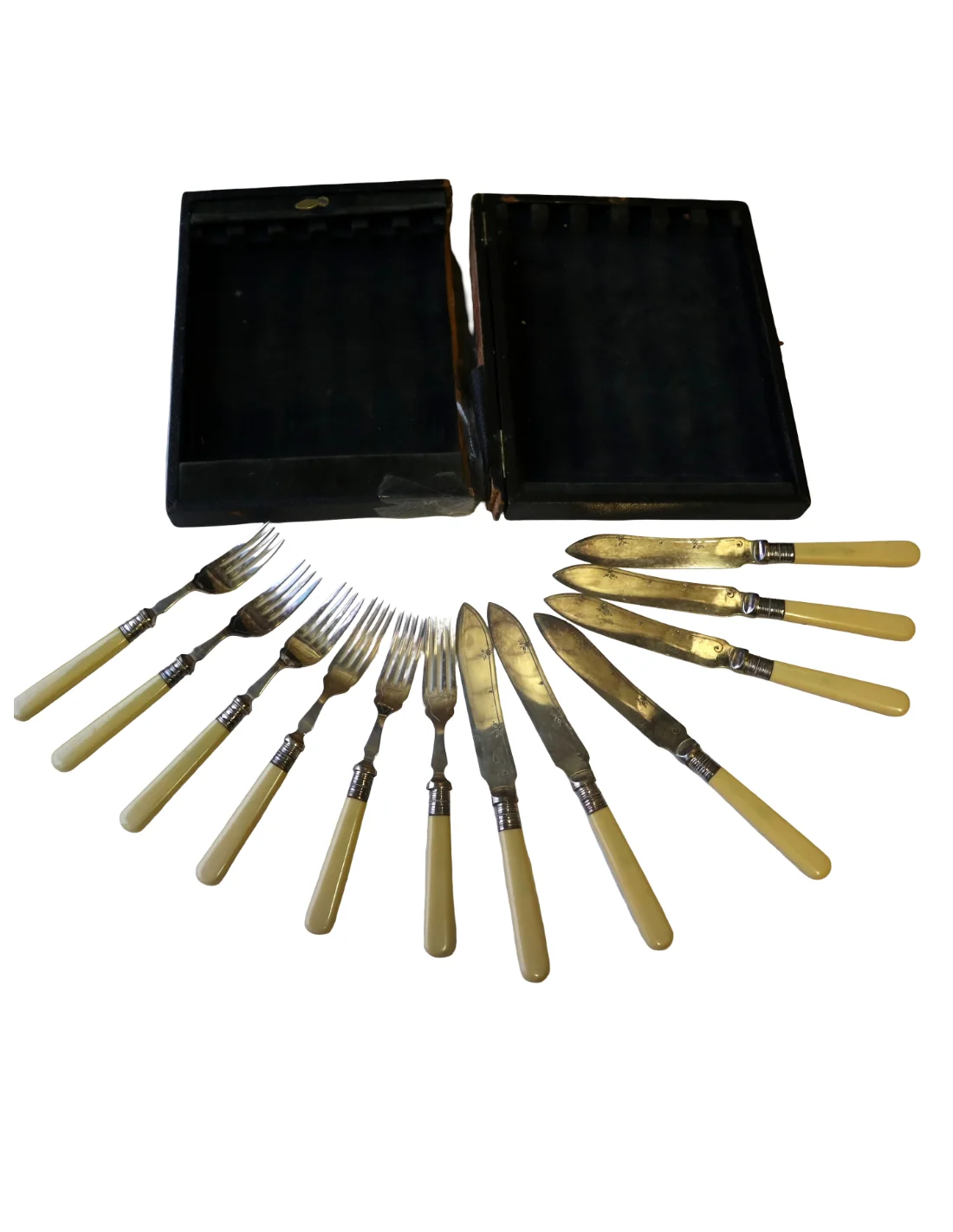Servizio Posate da Pesce Inglesi Fine ‘800 – Inizio ‘900 – Manici Color Avorio, 6 Forchette e 6 Coltelli Cesellati – Set Antico