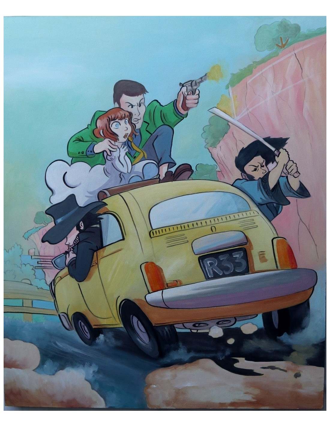 Questa straordinaria opera d'arte cattura l'essenza dell'avventura e dell'umorismo con la rappresentazione di Lupin III e Margot a bordo di una mitica Fiat 500.
