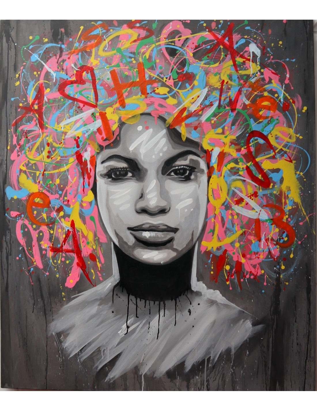 Volto Femminile Vibrante: Il quadro cattura l'essenza della bellezza femminile con uno sfondo grigio-nero che mette in risalto il volto dai capelli coloratissimi. Questa rappresentazione pop di una donna incarna l'energia, la vitalità e la diversità delle donne di tutto il mondo.