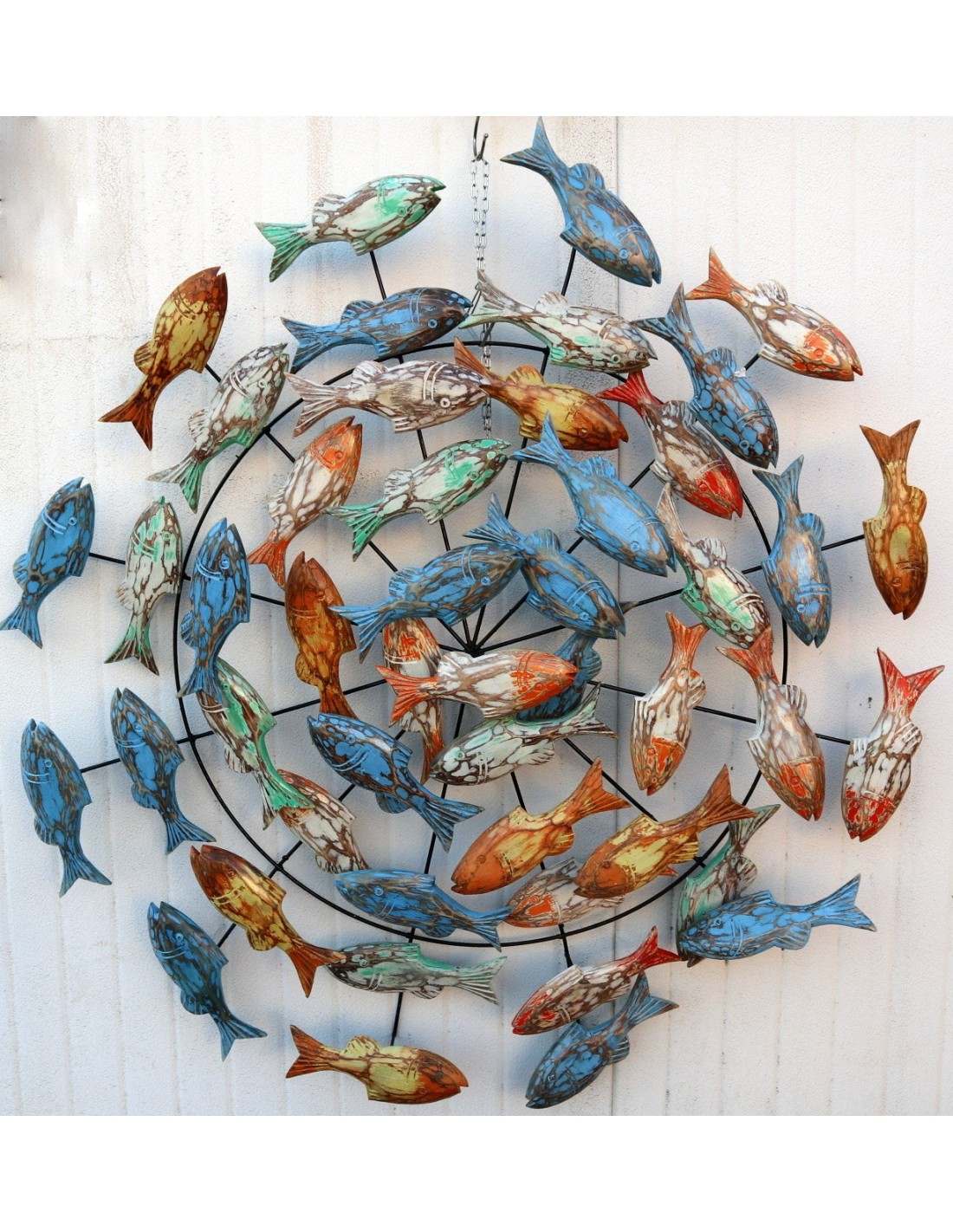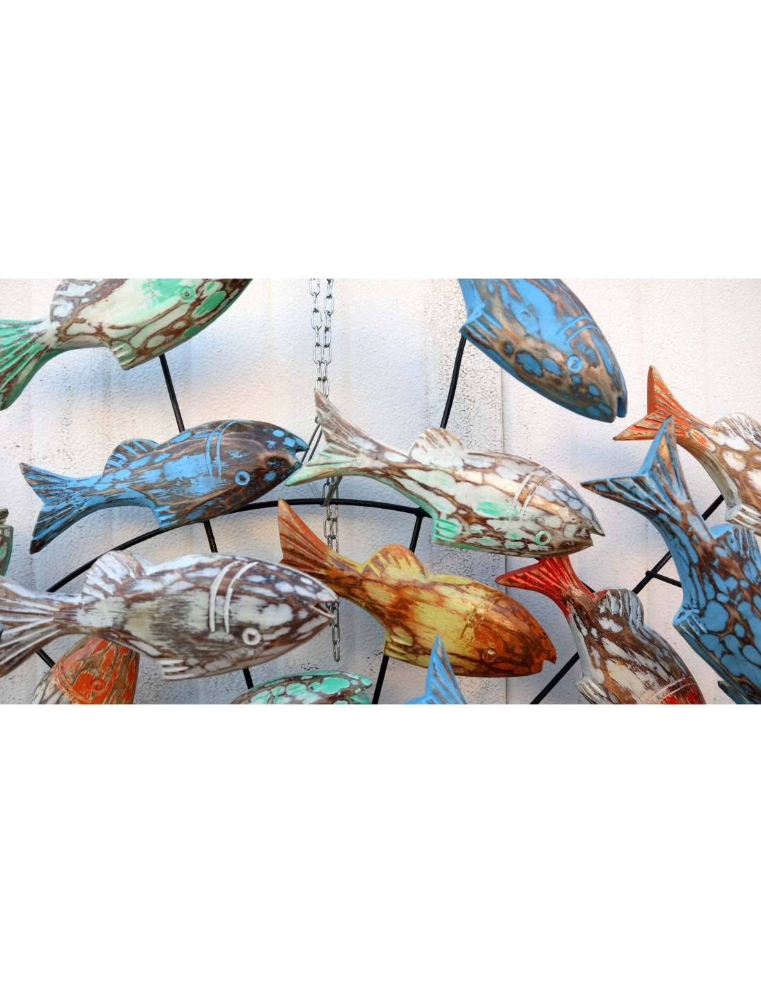 Questo pannello rotondo misura 100x15 cm ed è realizzato interamente a mano, con metallo come base e pesci intagliati in legno che vengono successivamente dipinti a mano con colori vivaci.