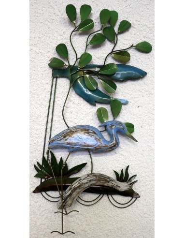 Pannello decorativo in metallo con fenicottero in legno blu, realizzato e dipinto a mano in Indonesia. Le dimensioni del pannello sono di 35x10x82 cm, perfetto per arredare con stile ed eleganza qualsiasi parete di casa o ufficio.