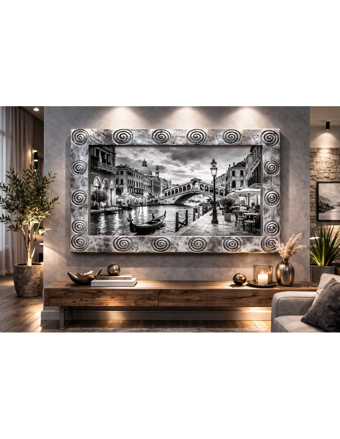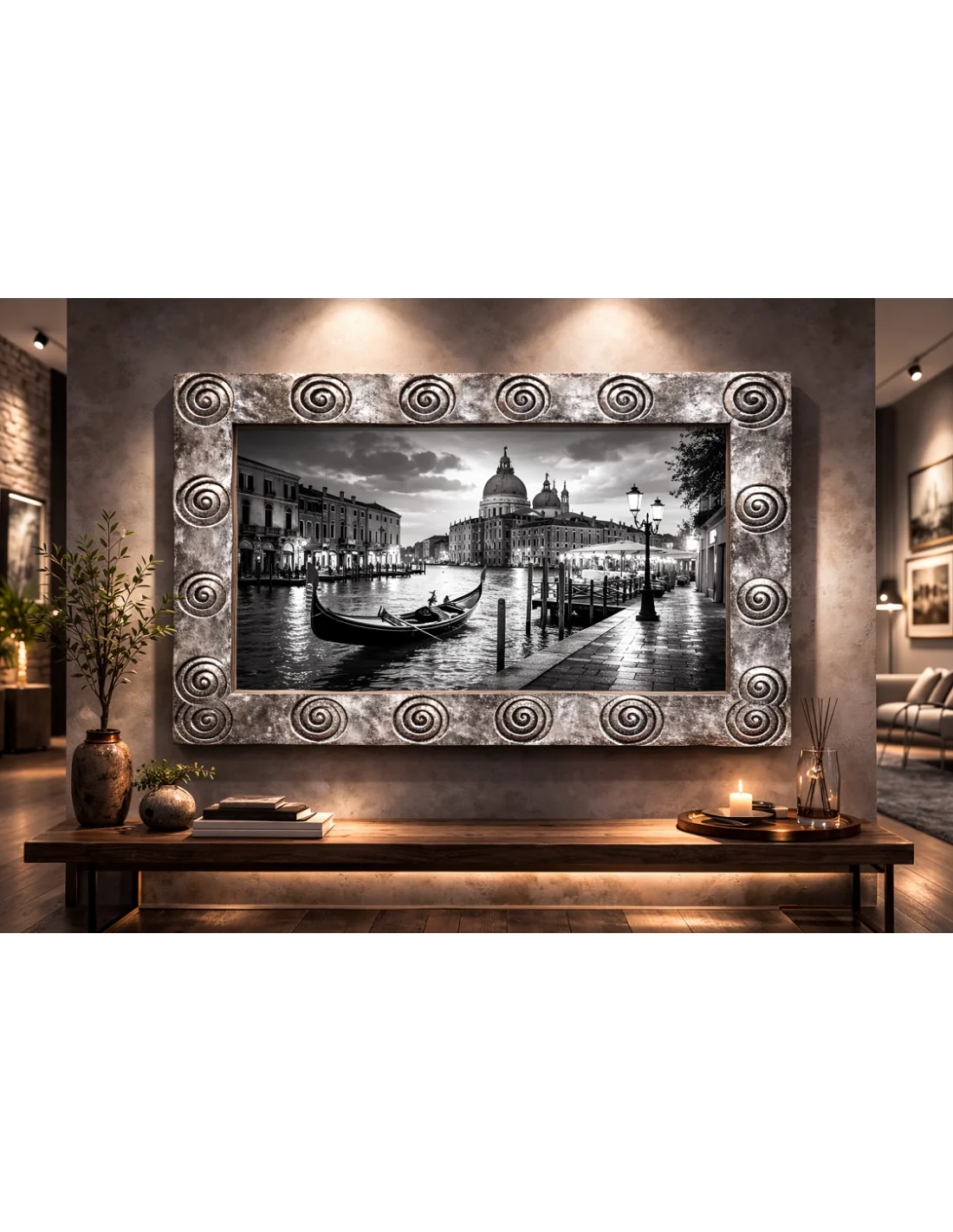 Questa cornice artigianale 120x80 cm è realizzata, incisa e dipinta interamente a mano in Indonesia da maestri artigiani. Il suo design con motivi spiraliformi scolpiti dona carattere e personalità a qualsiasi ambiente: living moderno, showroom, studio professionale o spazio espositivo.