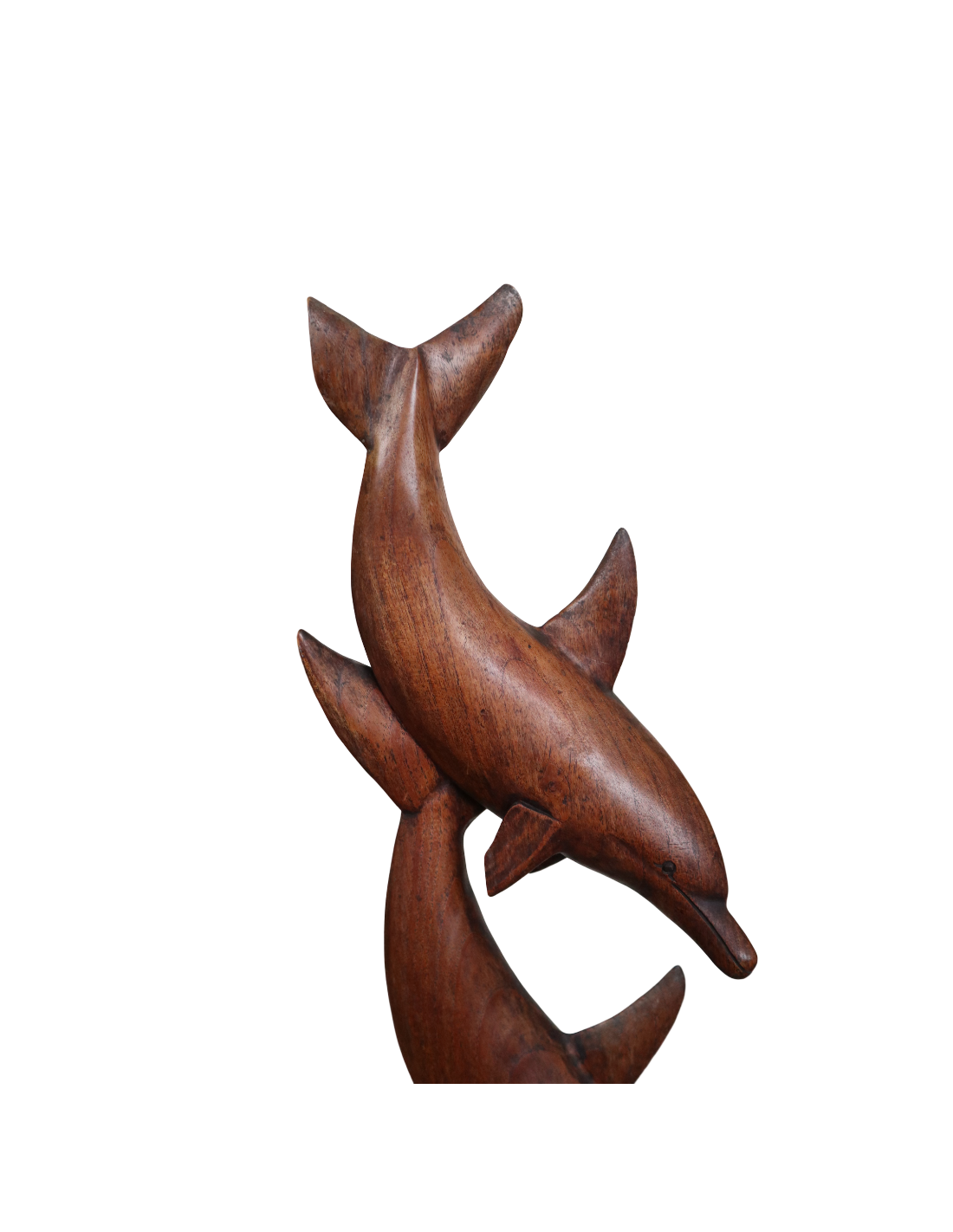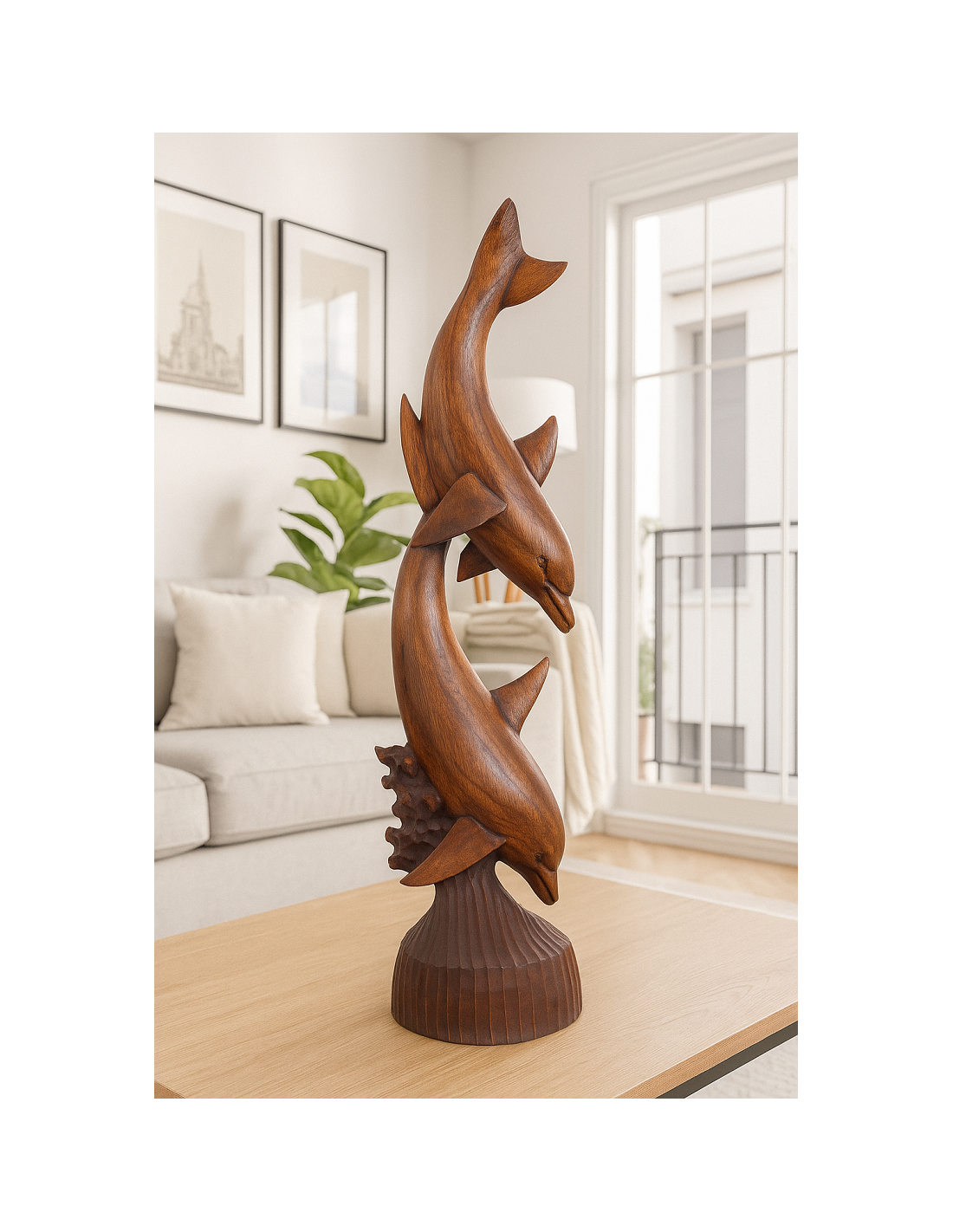 MarblechicElegante scultura artigianale in legno di teak raffigurante una coppia di delfini in movimento, simbolo di armonia, libertà e gioia di vivere.