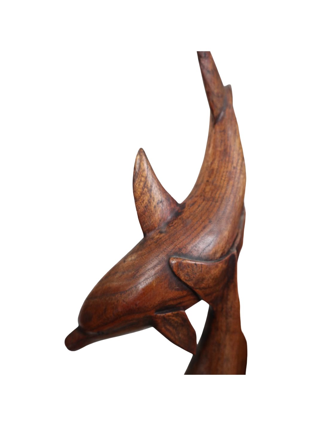 Elegante scultura artigianale in legno di teak raffigurante una coppia di delfini in movimento, simbolo di armonia, libertà e gioia di vivere.