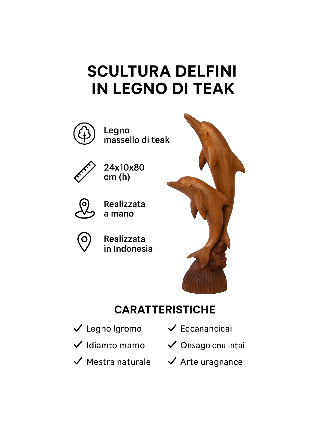 Scultura Delfini in Legno di Teak 24x10x80 cm – Statua Artigianale Realizzata a Mano in Indonesia
