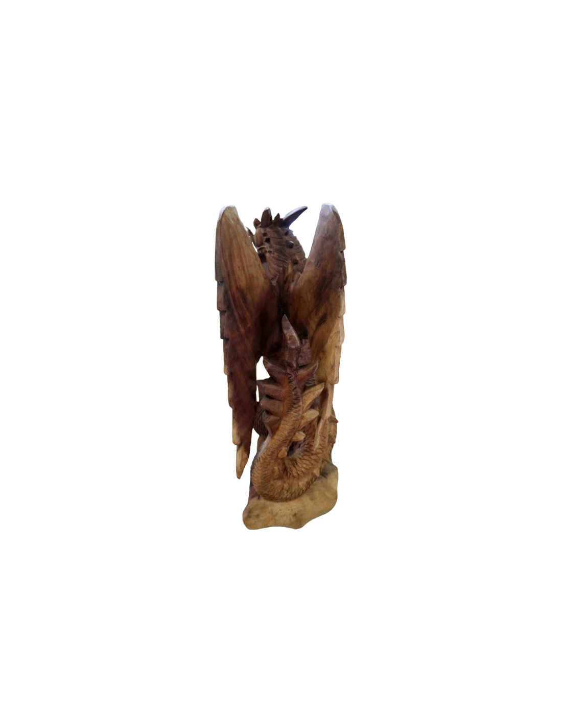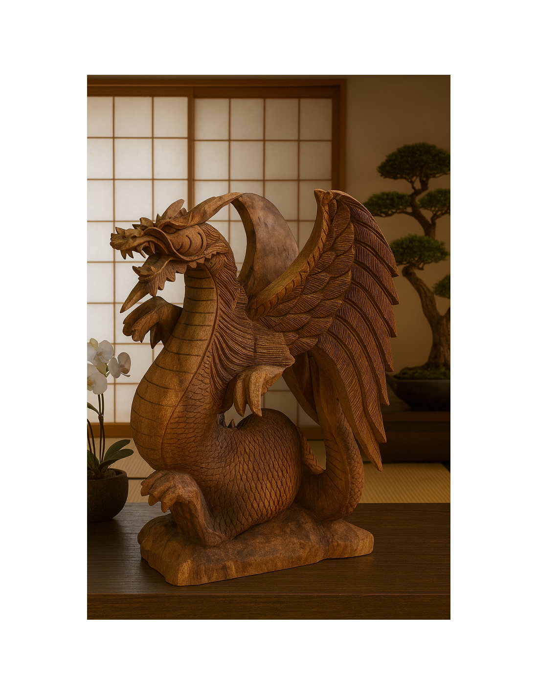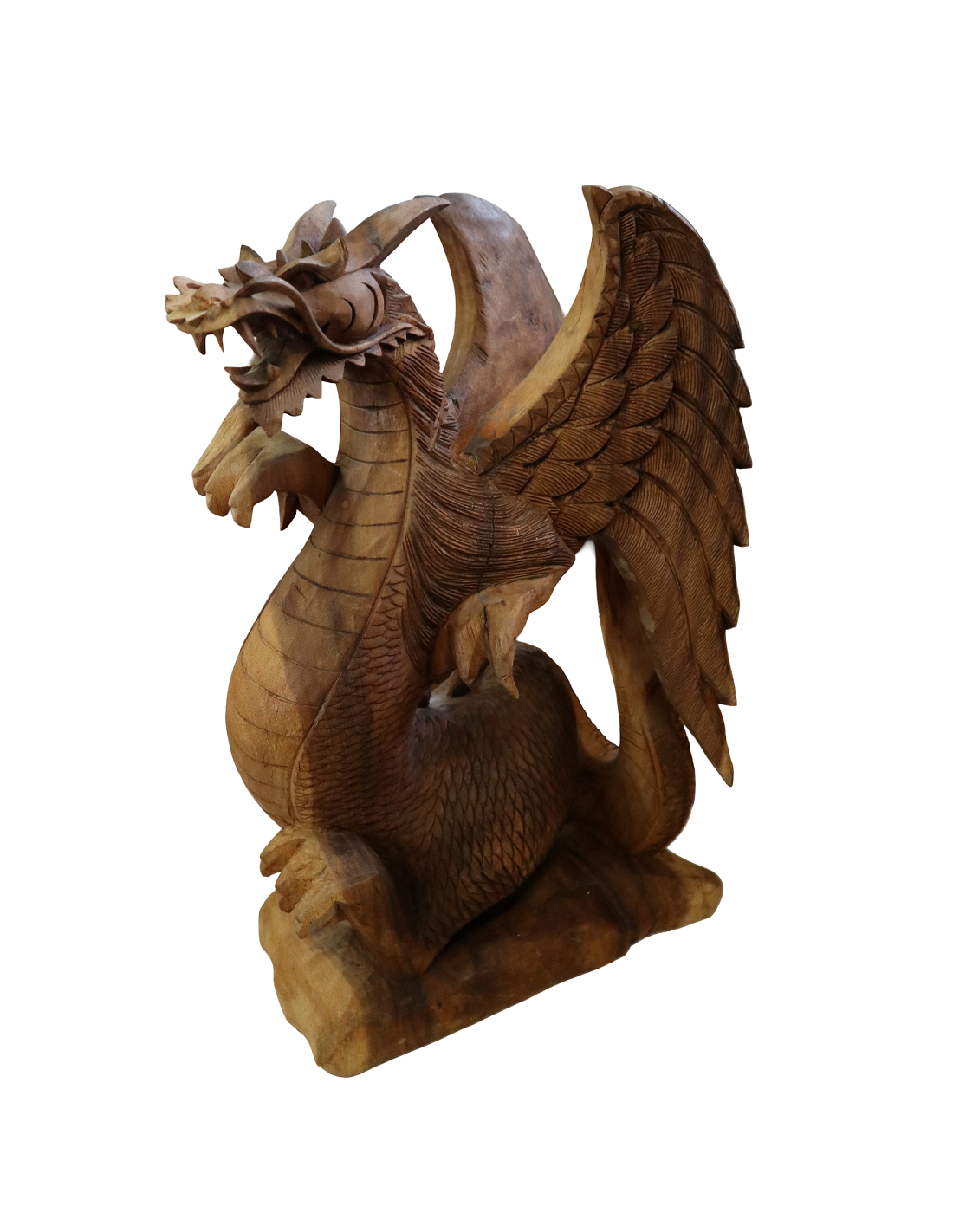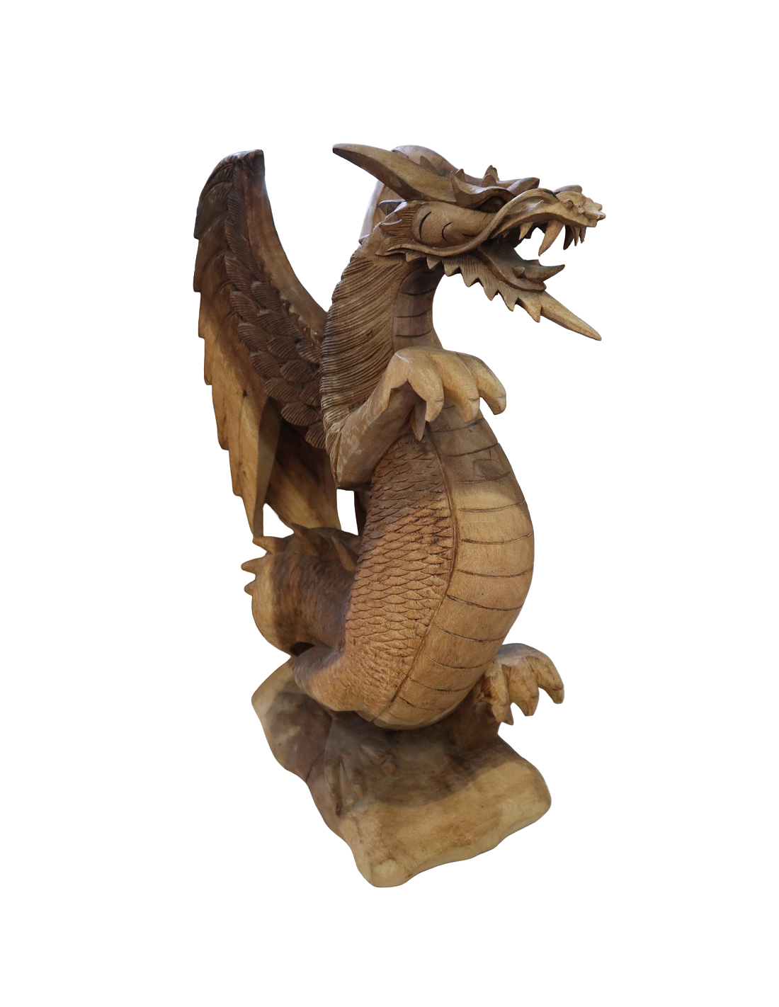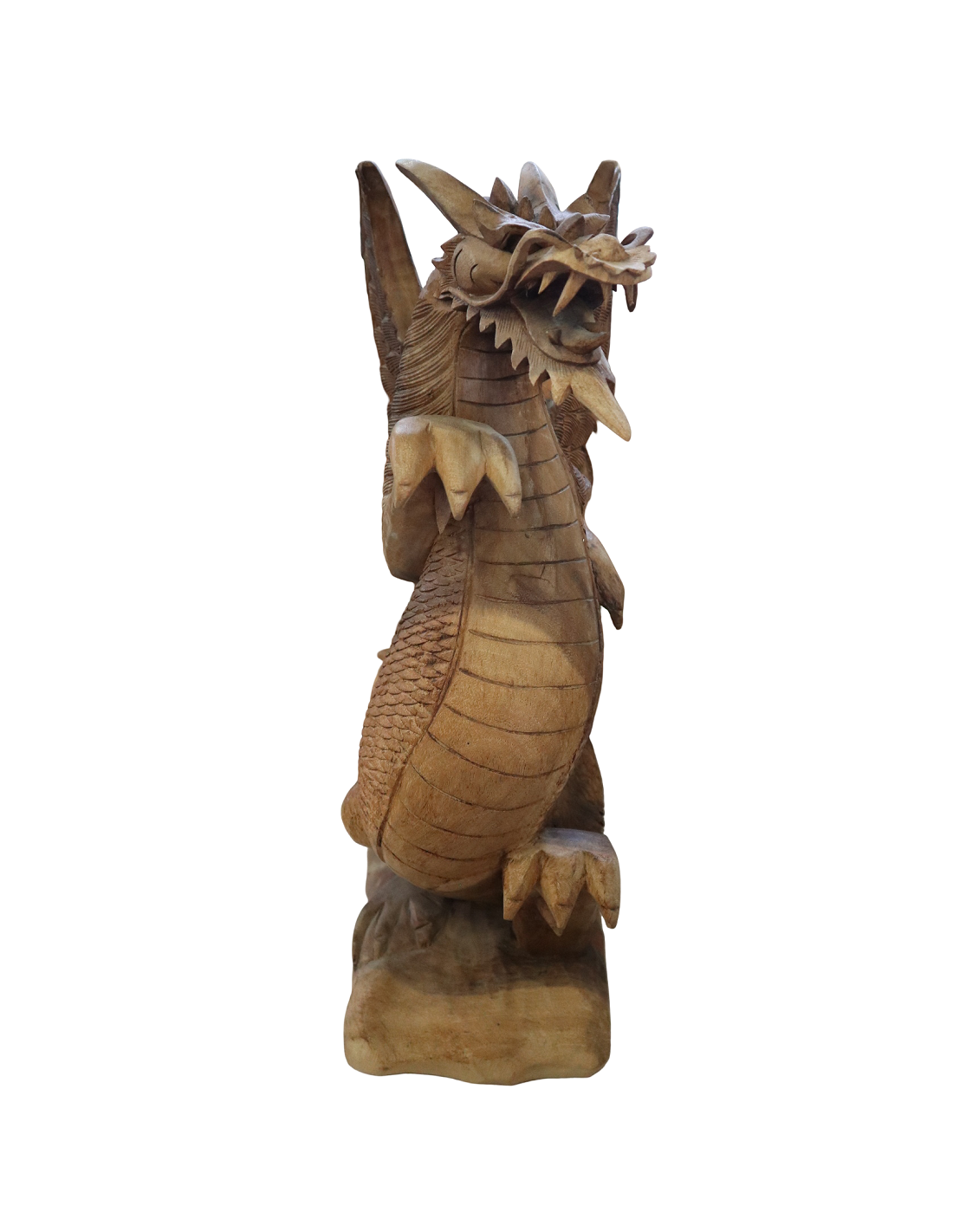 L’opera, dalle dimensioni 31×20×53 cm, è intagliata con incredibile precisione: le squame, le ali e l’espressione del drago sono curate in ogni dettaglio, valorizzando la bellezza naturale del legno.