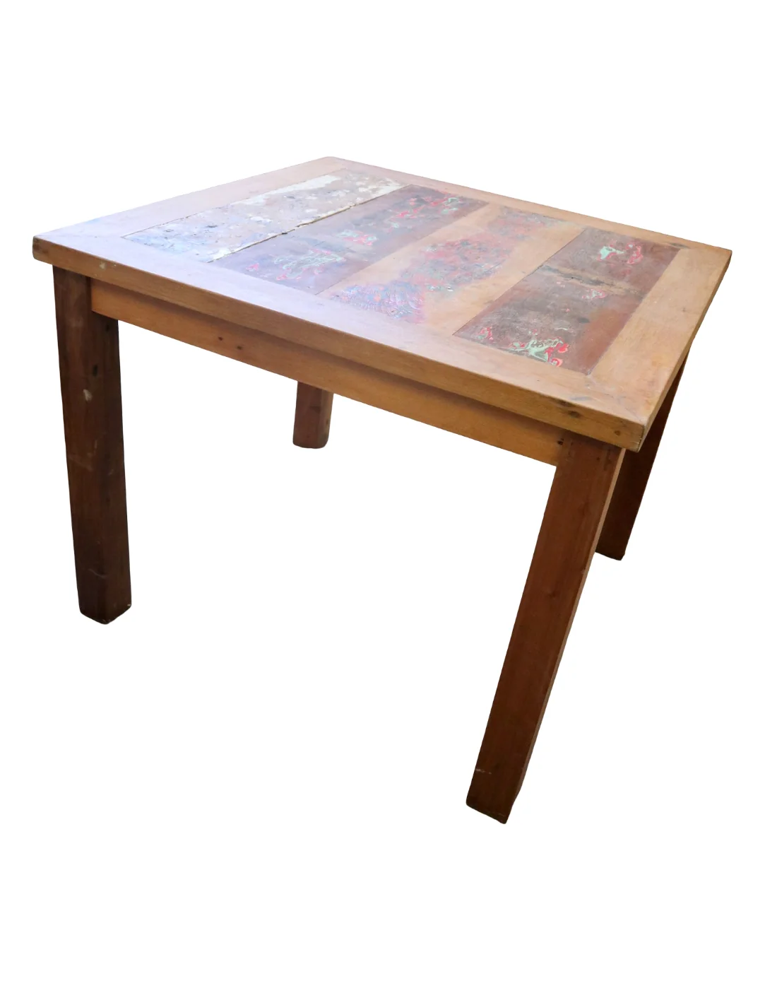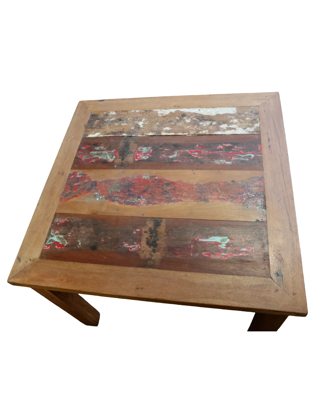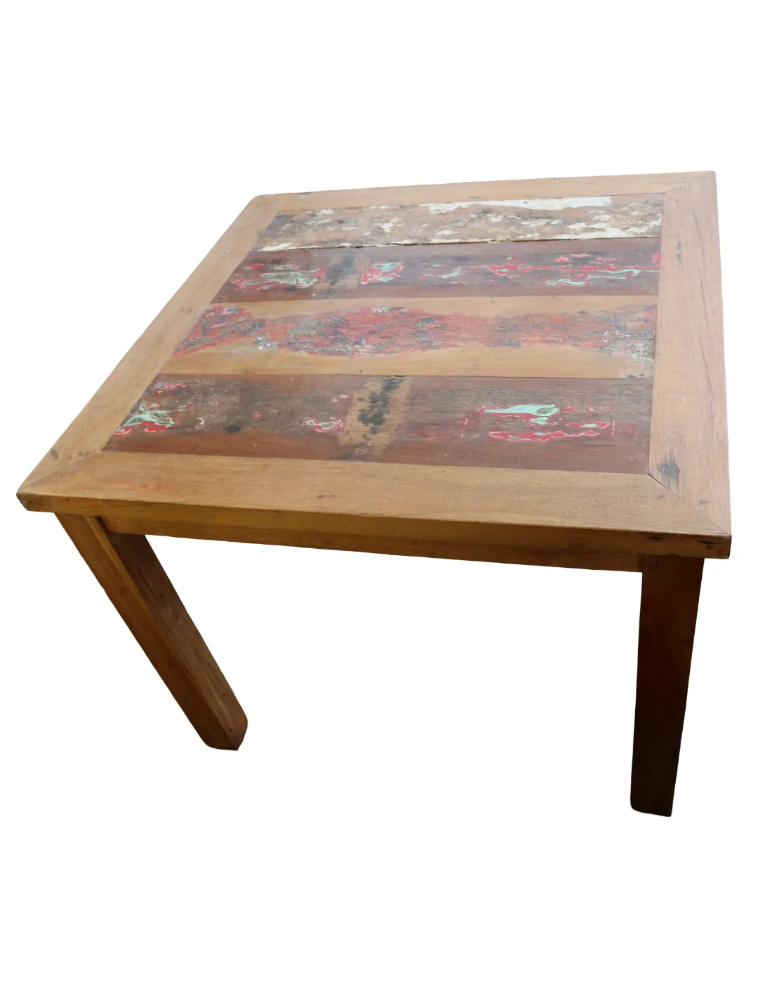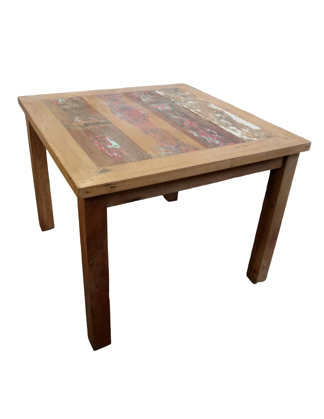 Questo tavolo quadrato 100x100 cm, alto 78 cm, è realizzato artigianalmente in Indonesia utilizzando legno massello recuperato da antiche imbarcazioni, treni e camion. Le superfici conservano tracce originali di vernici, segni del tempo e variazioni cromatiche naturali che rendono ogni pezzo unico e irripetibile.